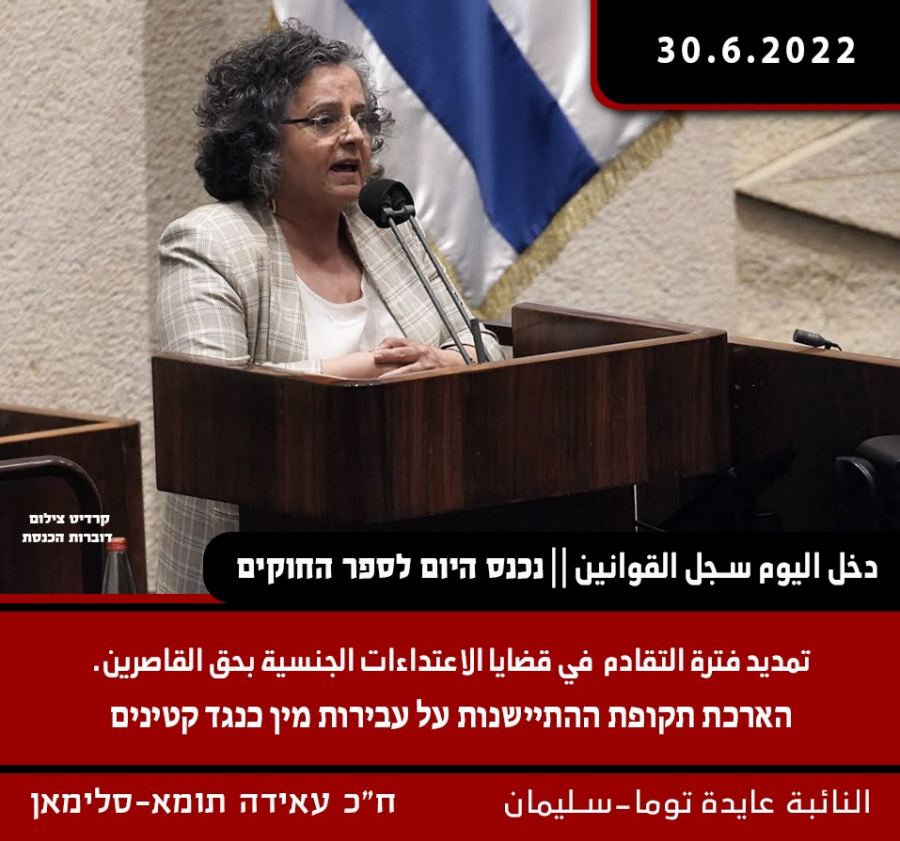 وفي تعقيبها على ذلك قالت توما-سليمان: "خلال سنين عملي الطويلة مع ضحايا الاعتداءات الجنسية تعرفت على الكثير من الحالات التي أفصح فيها الأشخاص عن تعرضهم لاعتداءات جنسية في صغرهم ولم تكن الفرصة متاحة أمامهم لتقديم شكوى بسبب مرور فترة طويلة من الزمن. هذا القانون حملته معي إلى الكنيست ليتيح المجال للمعتدى عليه القاصر بعد أن يكبر بتقديم الشكوى ومقاضاة المعتدي وأيضا المؤسسات التي لم تقم بواجبها لحماية القاصر ومنع الاعتداء".