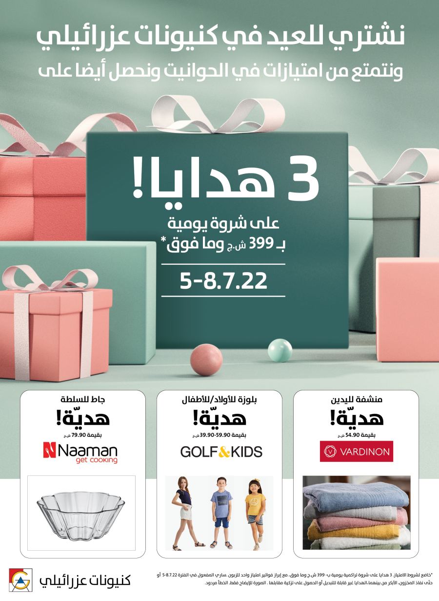 كنيونات عزرائيلي تدعوكم للقدوم إلى الكنيونات للقيام بمشتريات عيد الأضحى المبارك، وبهذه المناسبة المباركة تقدّم لكم 3 هدايا عند الشراء بمبلغ يومي تراكمي بقيمة 399 شيكل وما فوق من الحوانيت المشاركة في الحملة.