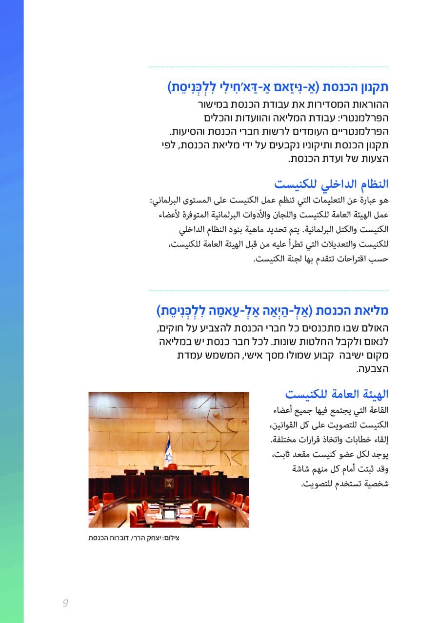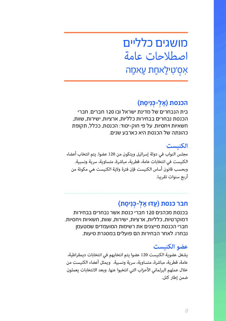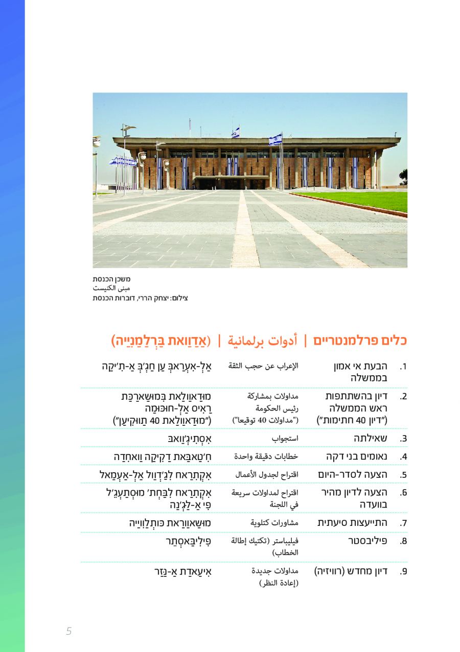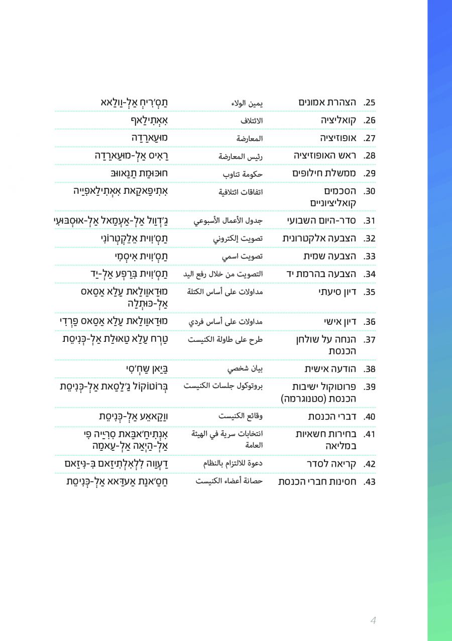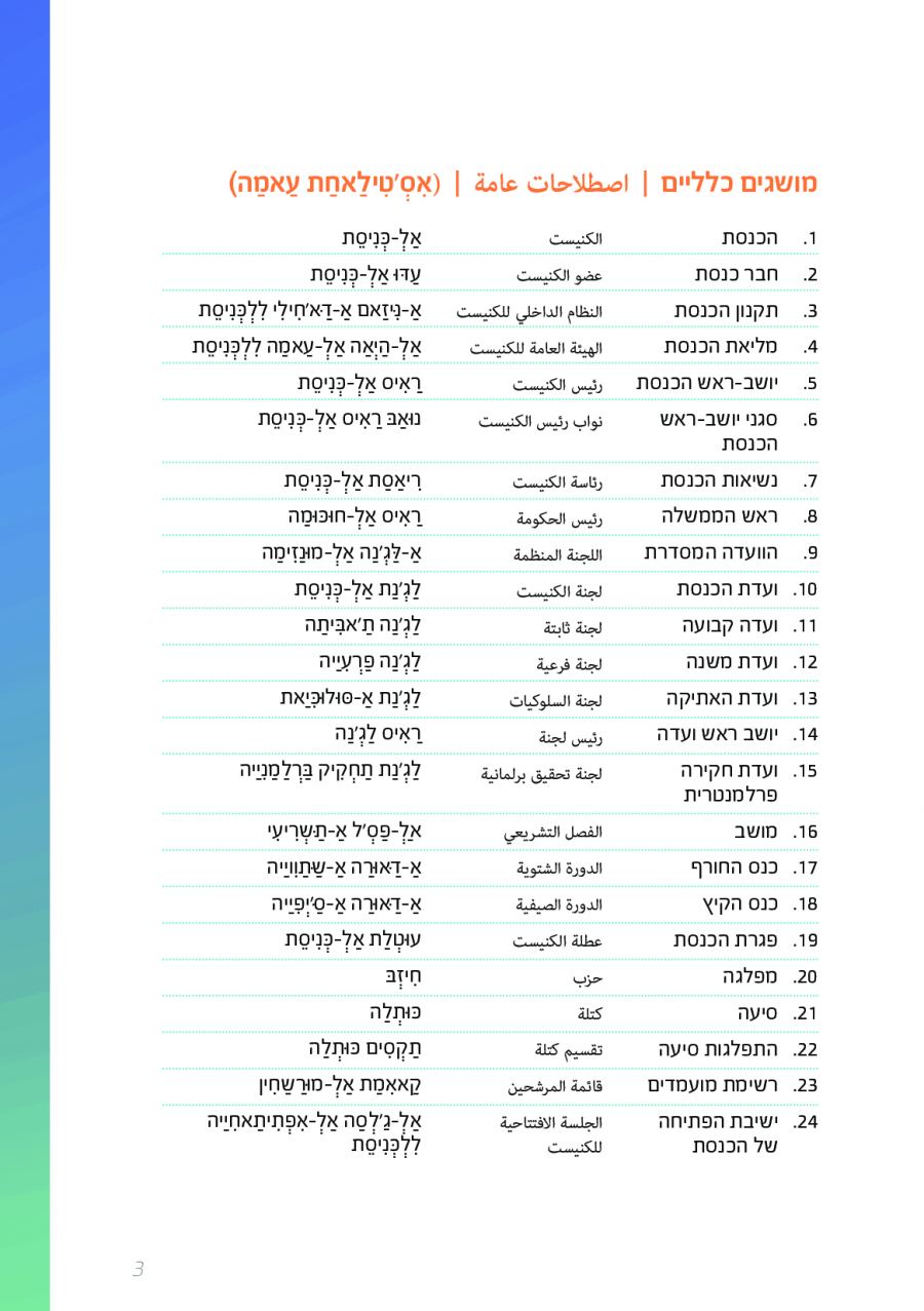 يحتوي الكتيب الجديد على عشرات الاصطلاحات البرلمانية الأساسية المستخدمة في الكنيست الإسرائيلية وهي مكتوبة باللغتين العبرية والعربية، مع إرفاق شرح مفصل حول كل اصطلاح بهاتين اللغتين.