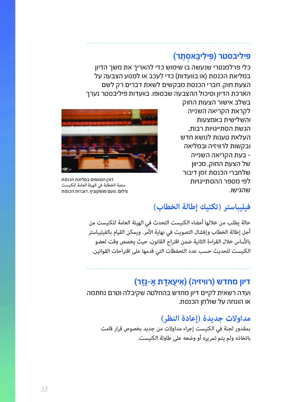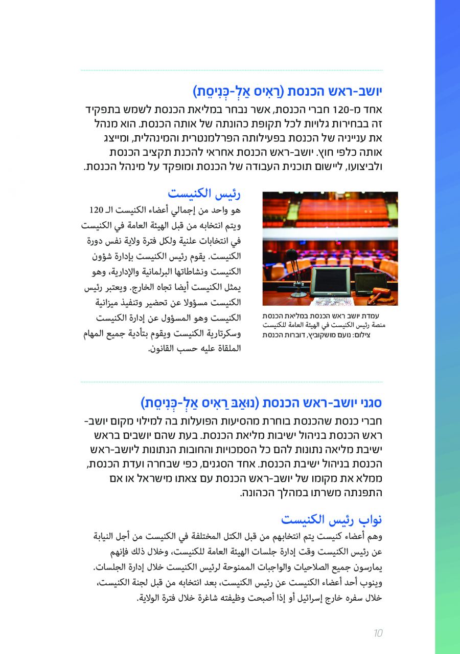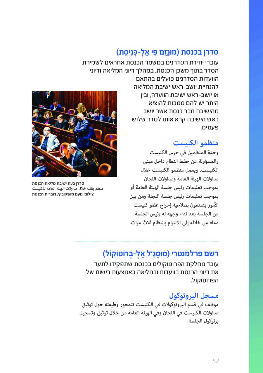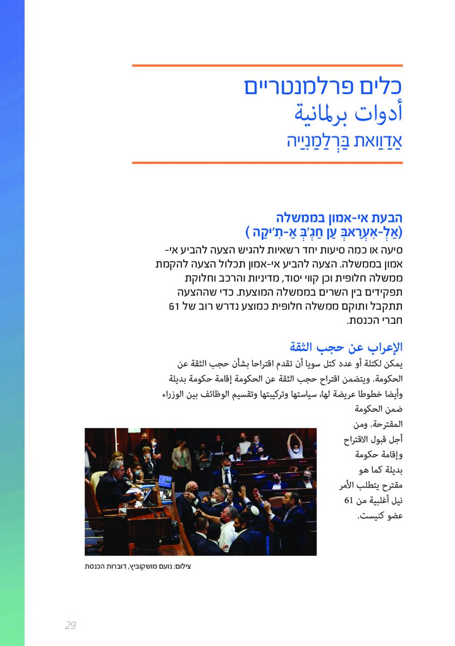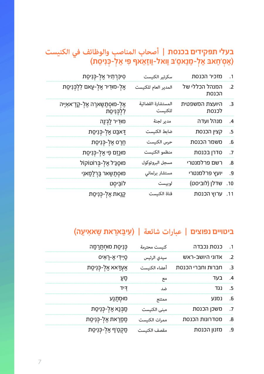 يحتوي الكتيب الجديد على عشرات الاصطلاحات البرلمانية الأساسية المستخدمة في الكنيست الإسرائيلية وهي مكتوبة باللغتين العبرية والعربية، مع إرفاق شرح مفصل حول كل اصطلاح بهاتين اللغتين.