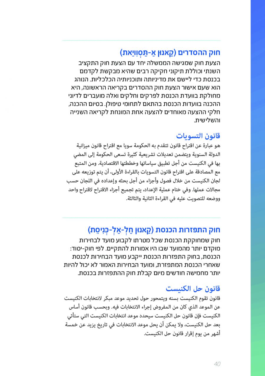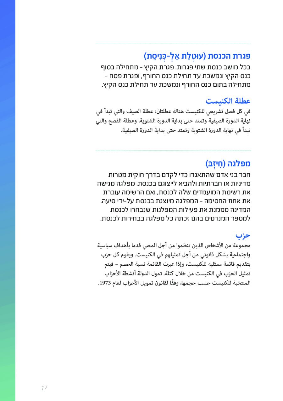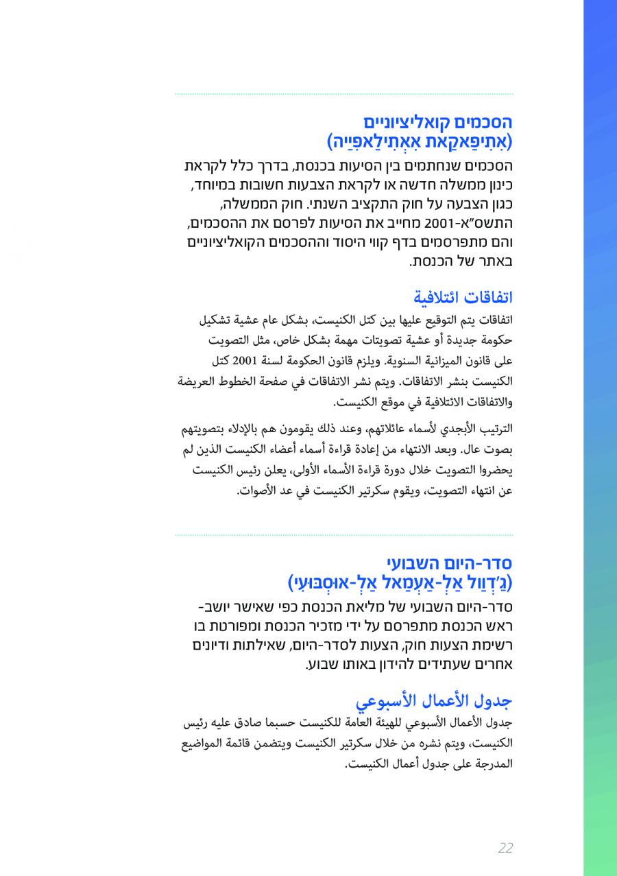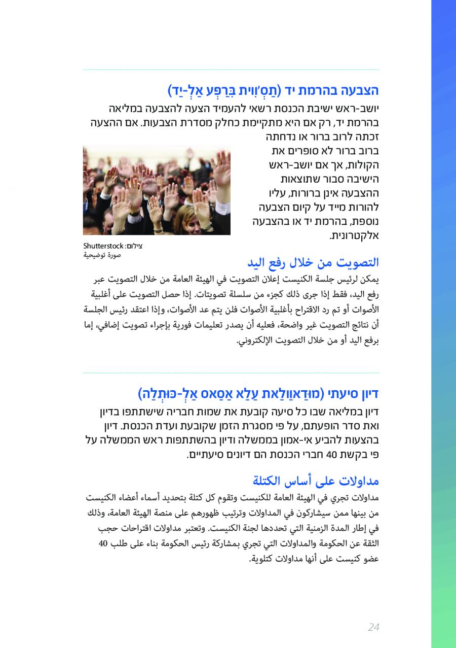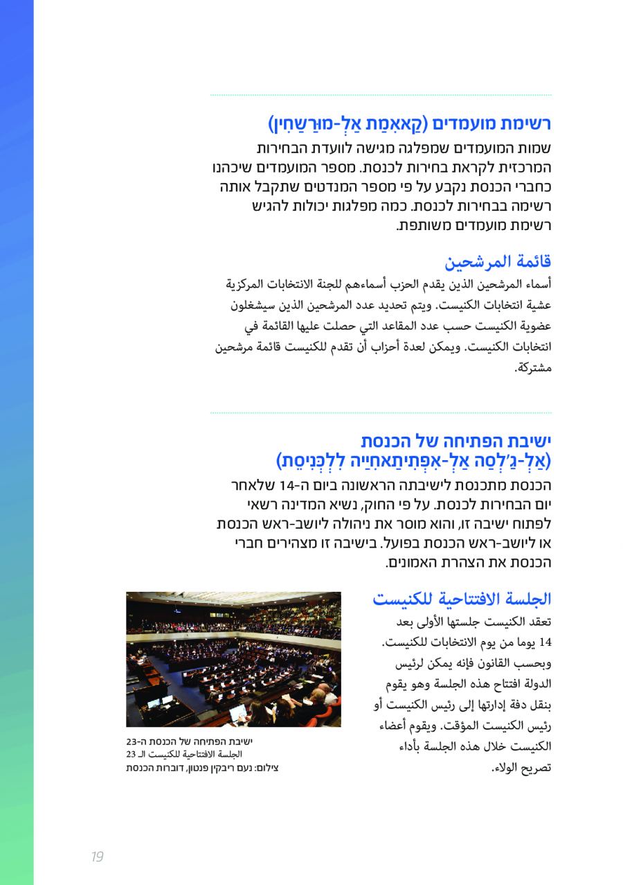 يحتوي الكتيب الجديد على عشرات الاصطلاحات البرلمانية الأساسية المستخدمة في الكنيست الإسرائيلية وهي مكتوبة باللغتين العبرية والعربية، مع إرفاق شرح مفصل حول كل اصطلاح بهاتين اللغتين.