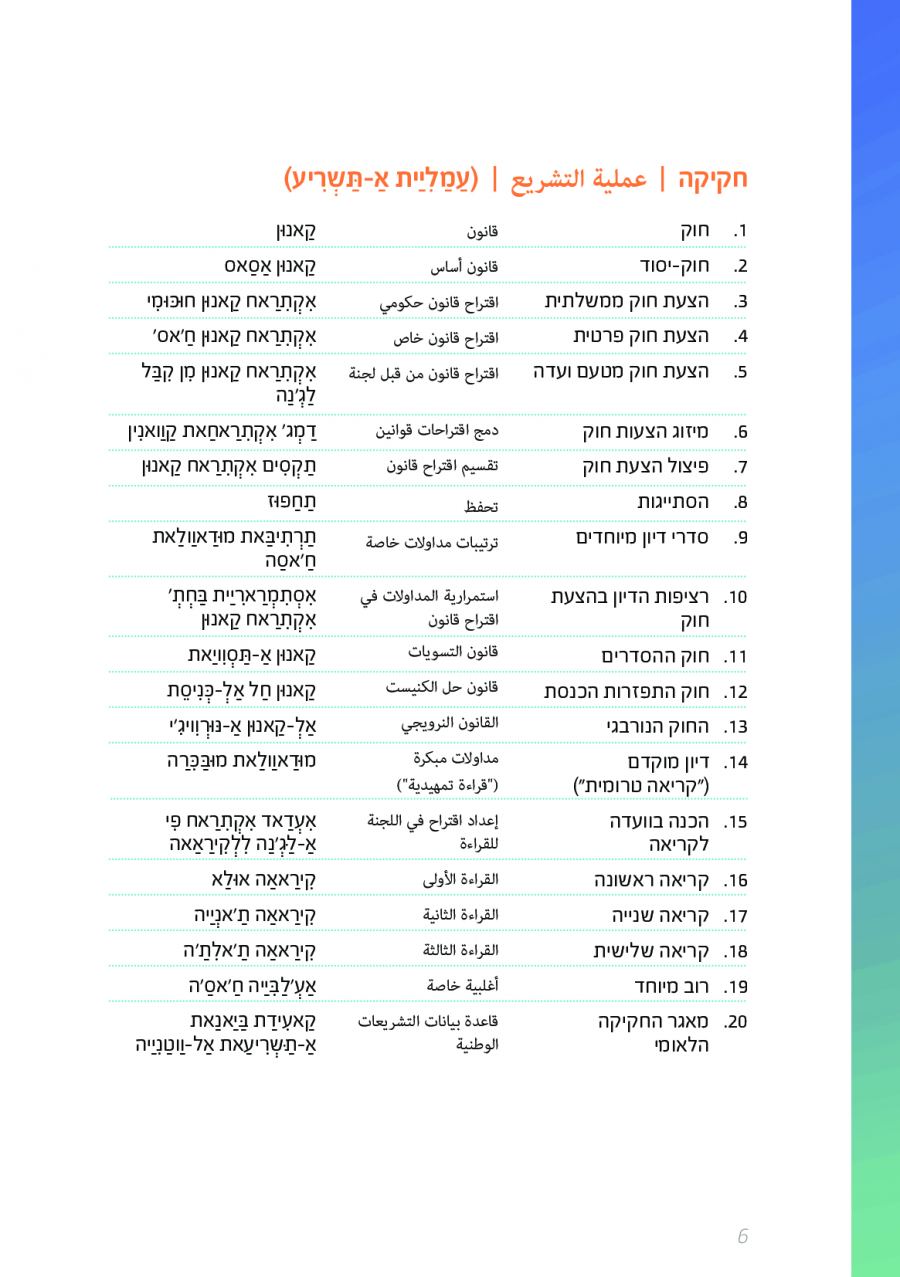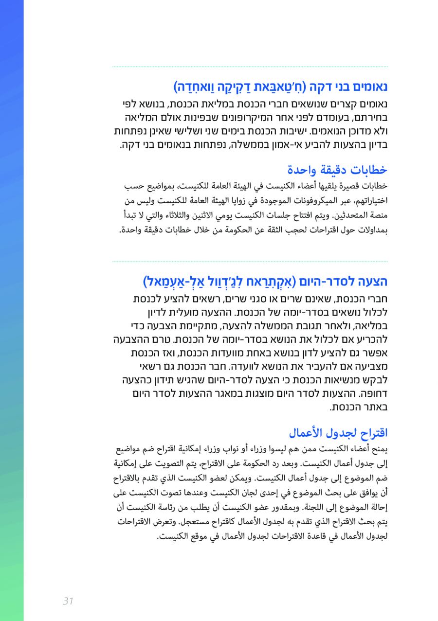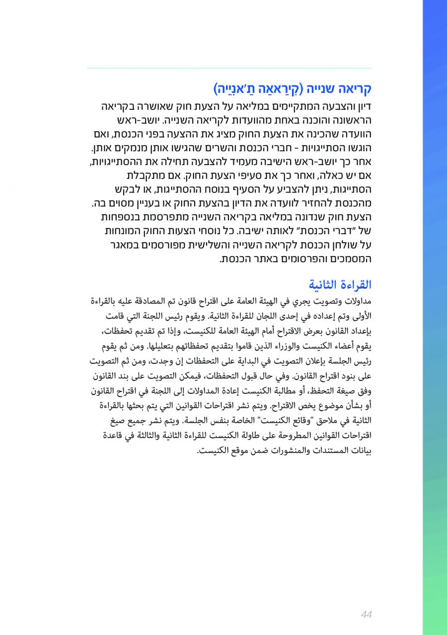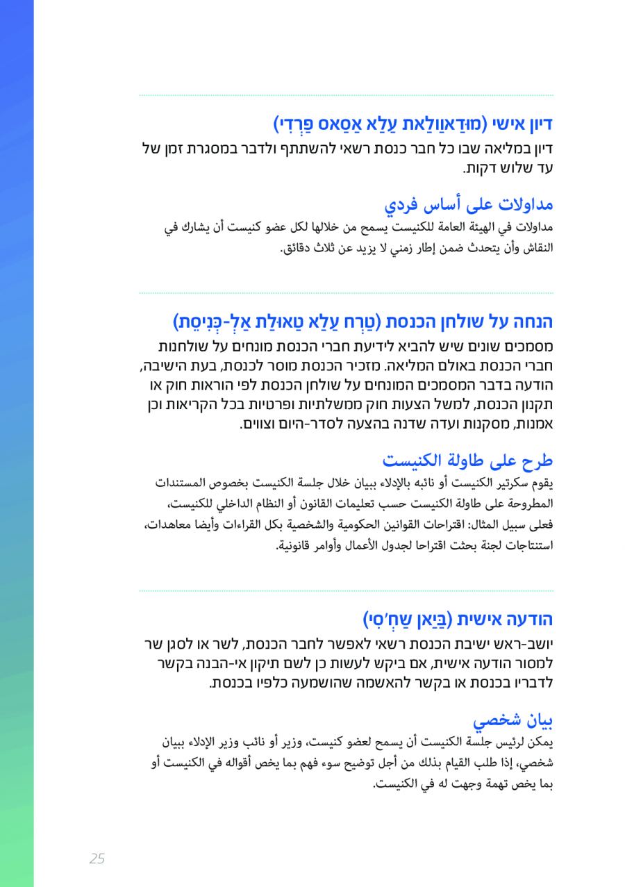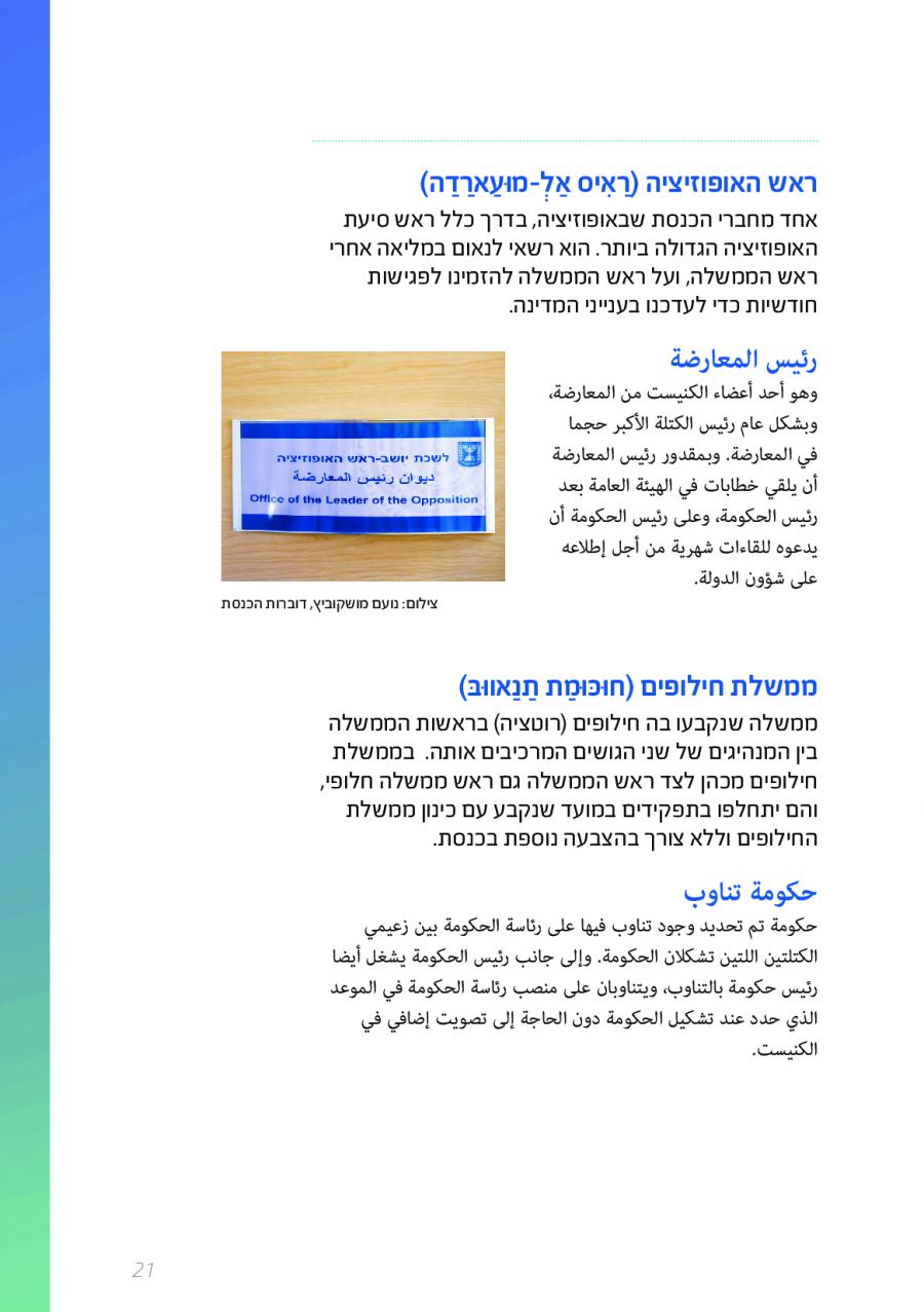 يحتوي الكتيب الجديد على عشرات الاصطلاحات البرلمانية الأساسية المستخدمة في الكنيست الإسرائيلية وهي مكتوبة باللغتين العبرية والعربية، مع إرفاق شرح مفصل حول كل اصطلاح بهاتين اللغتين.