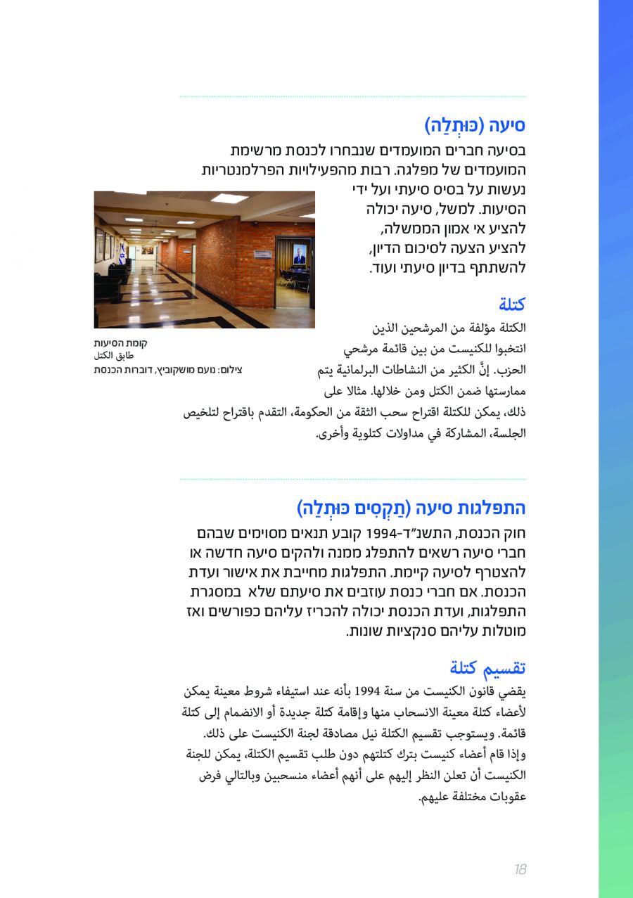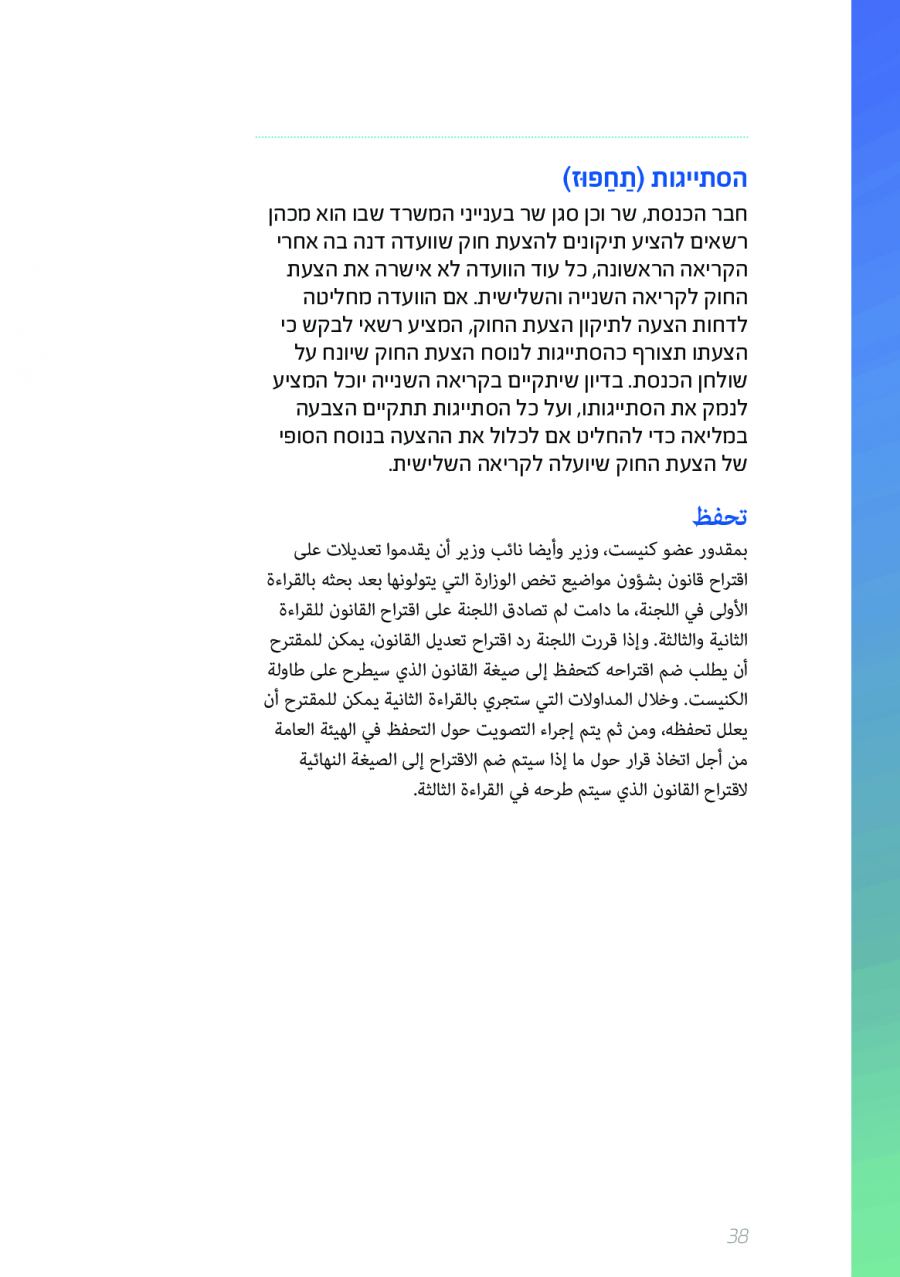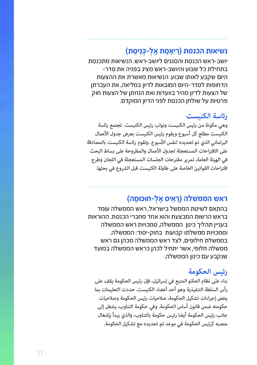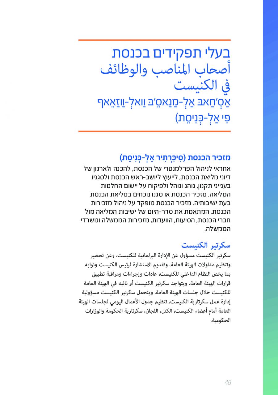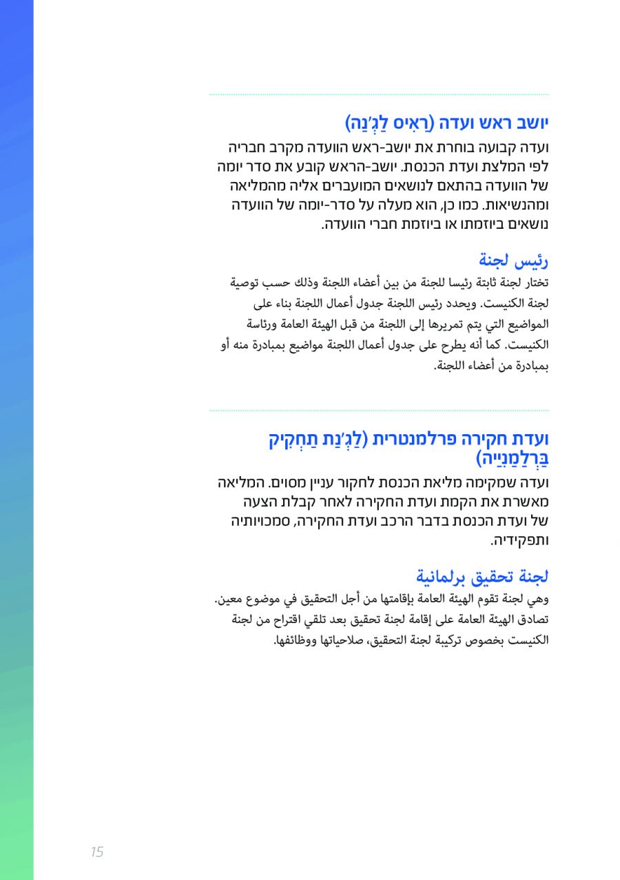 يحتوي الكتيب الجديد على عشرات الاصطلاحات البرلمانية الأساسية المستخدمة في الكنيست الإسرائيلية وهي مكتوبة باللغتين العبرية والعربية، مع إرفاق شرح مفصل حول كل اصطلاح بهاتين اللغتين.