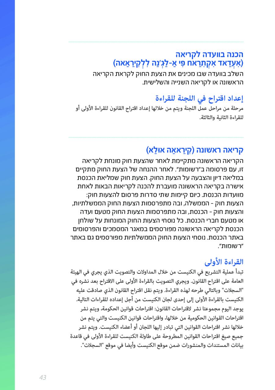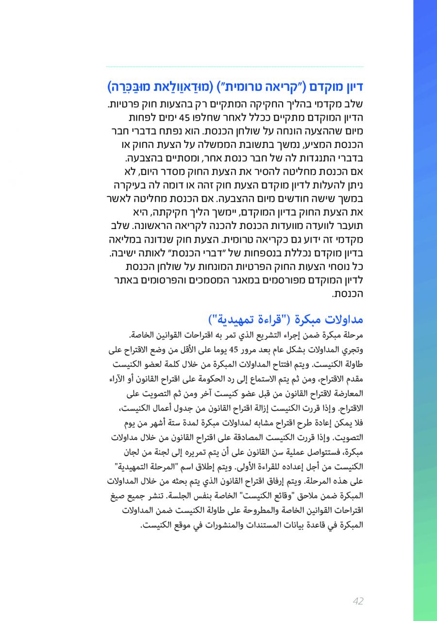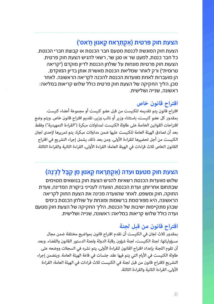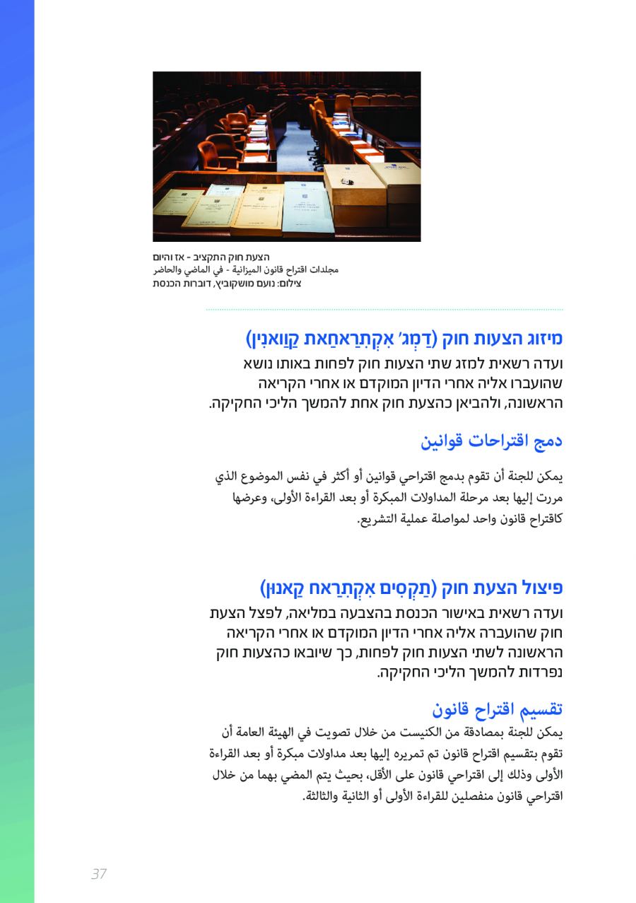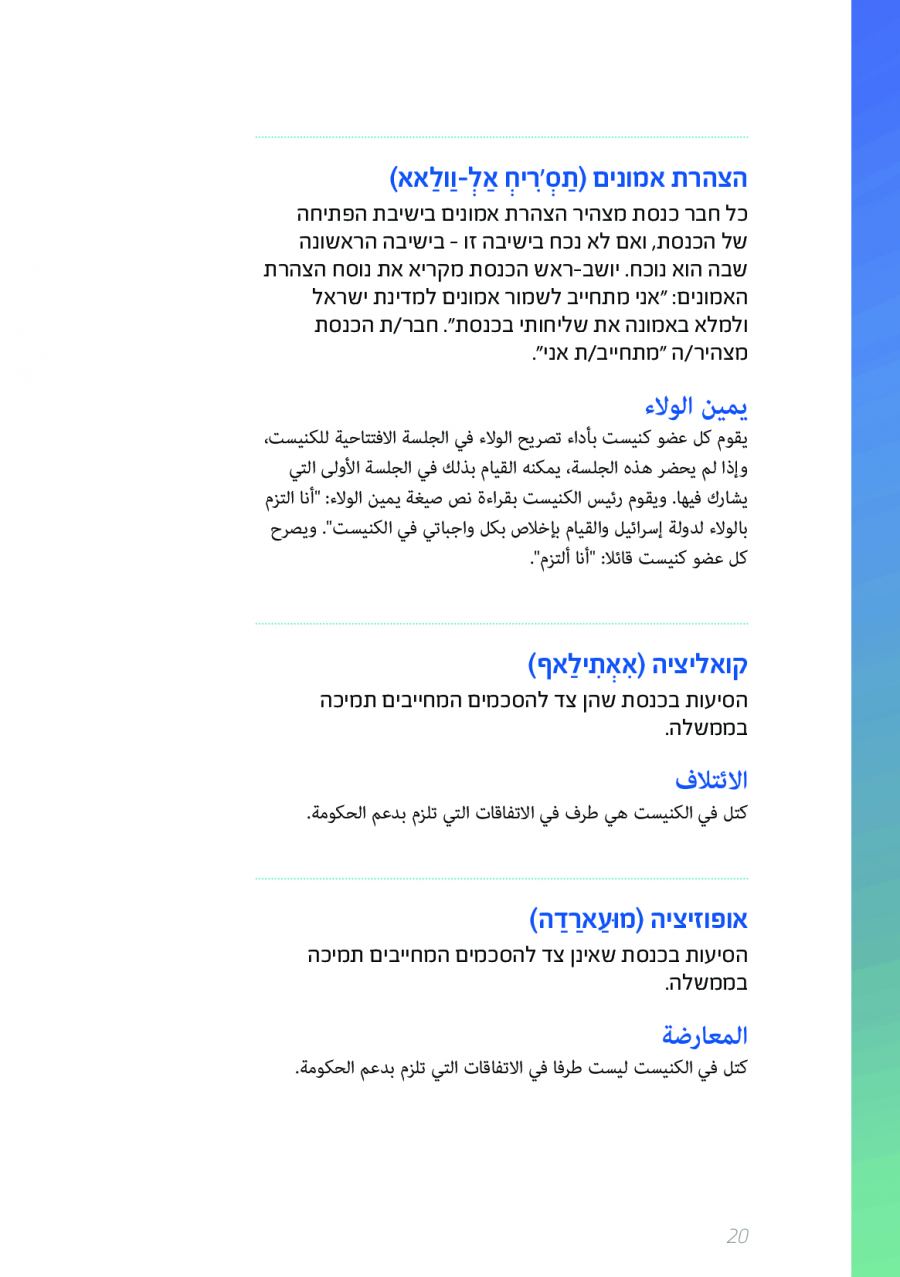 يحتوي الكتيب الجديد على عشرات الاصطلاحات البرلمانية الأساسية المستخدمة في الكنيست الإسرائيلية وهي مكتوبة باللغتين العبرية والعربية، مع إرفاق شرح مفصل حول كل اصطلاح بهاتين اللغتين.