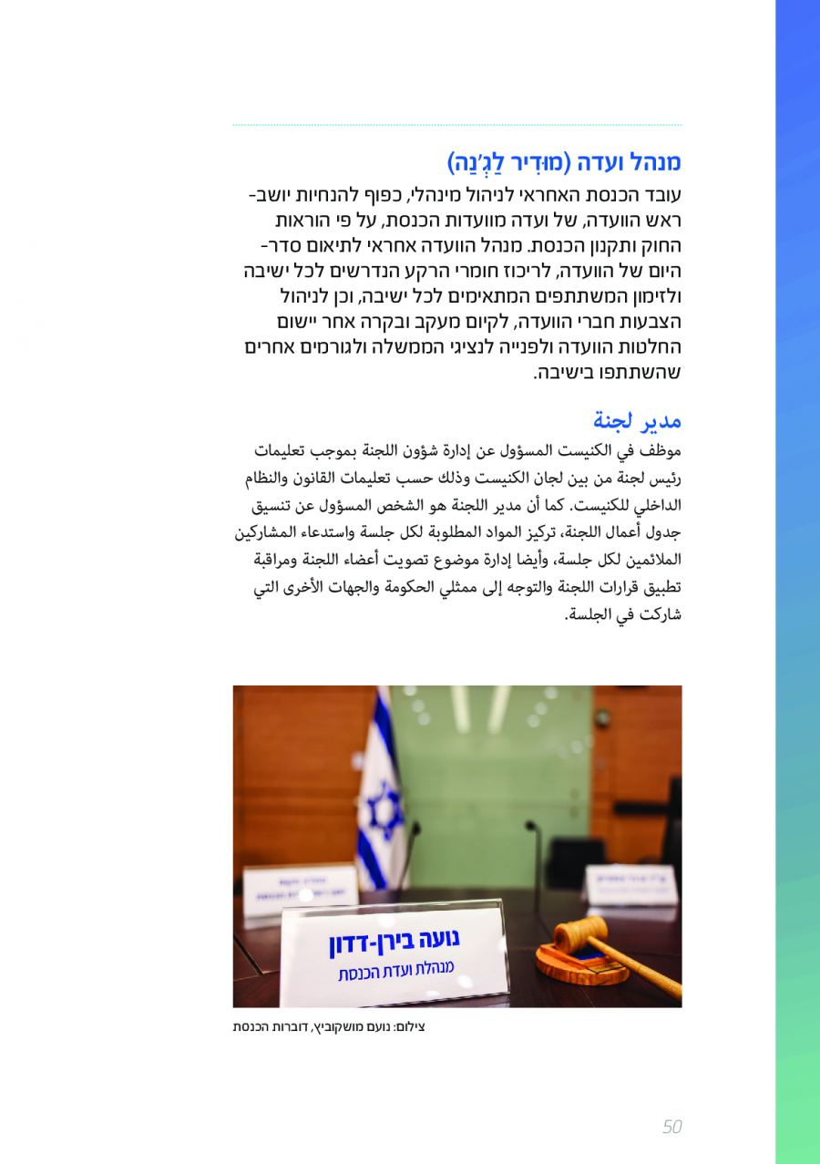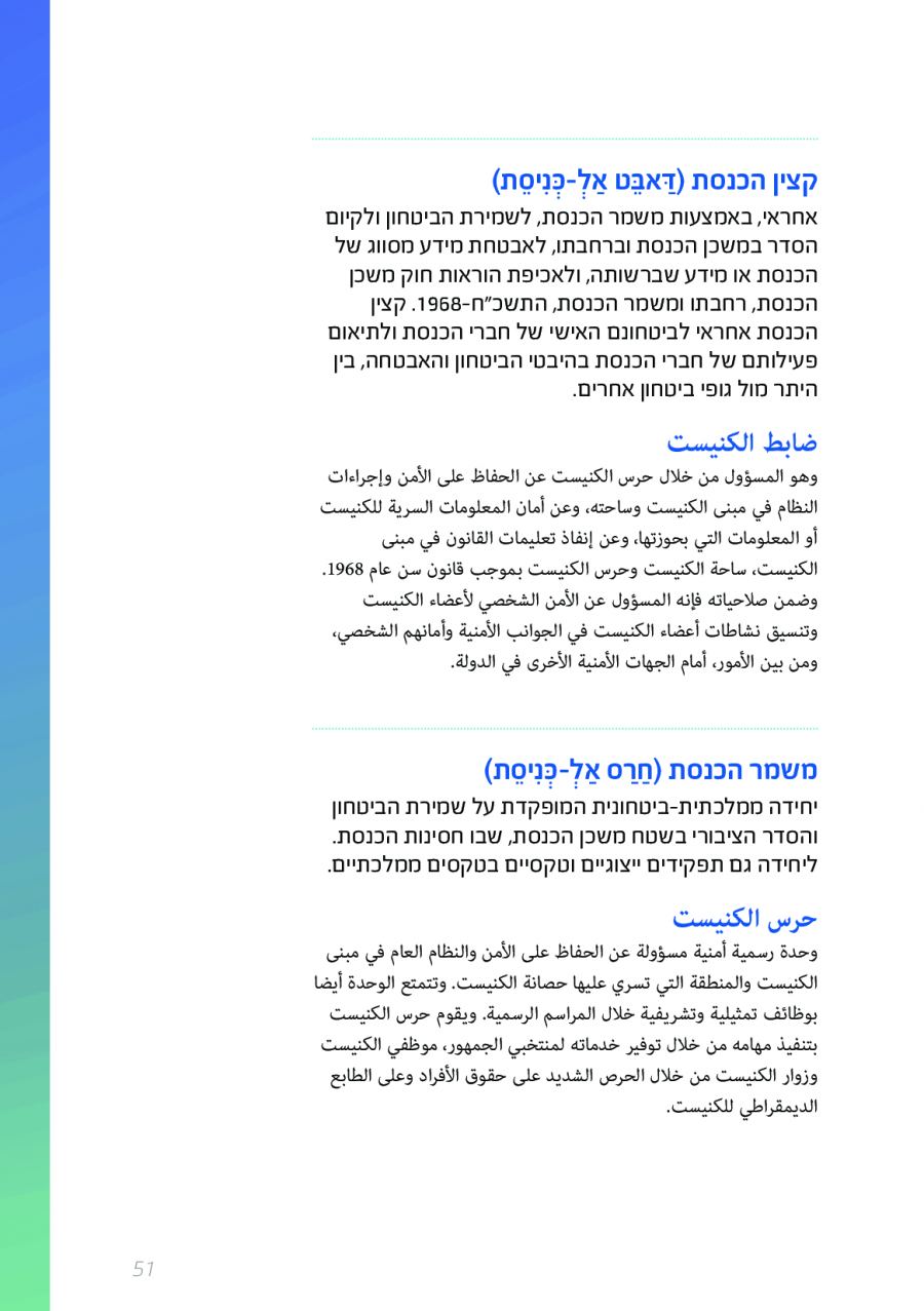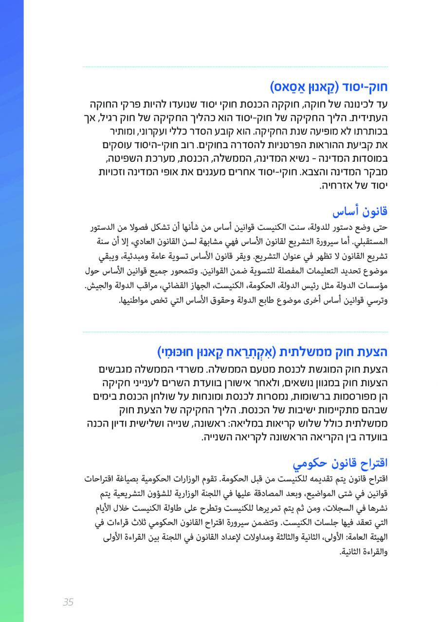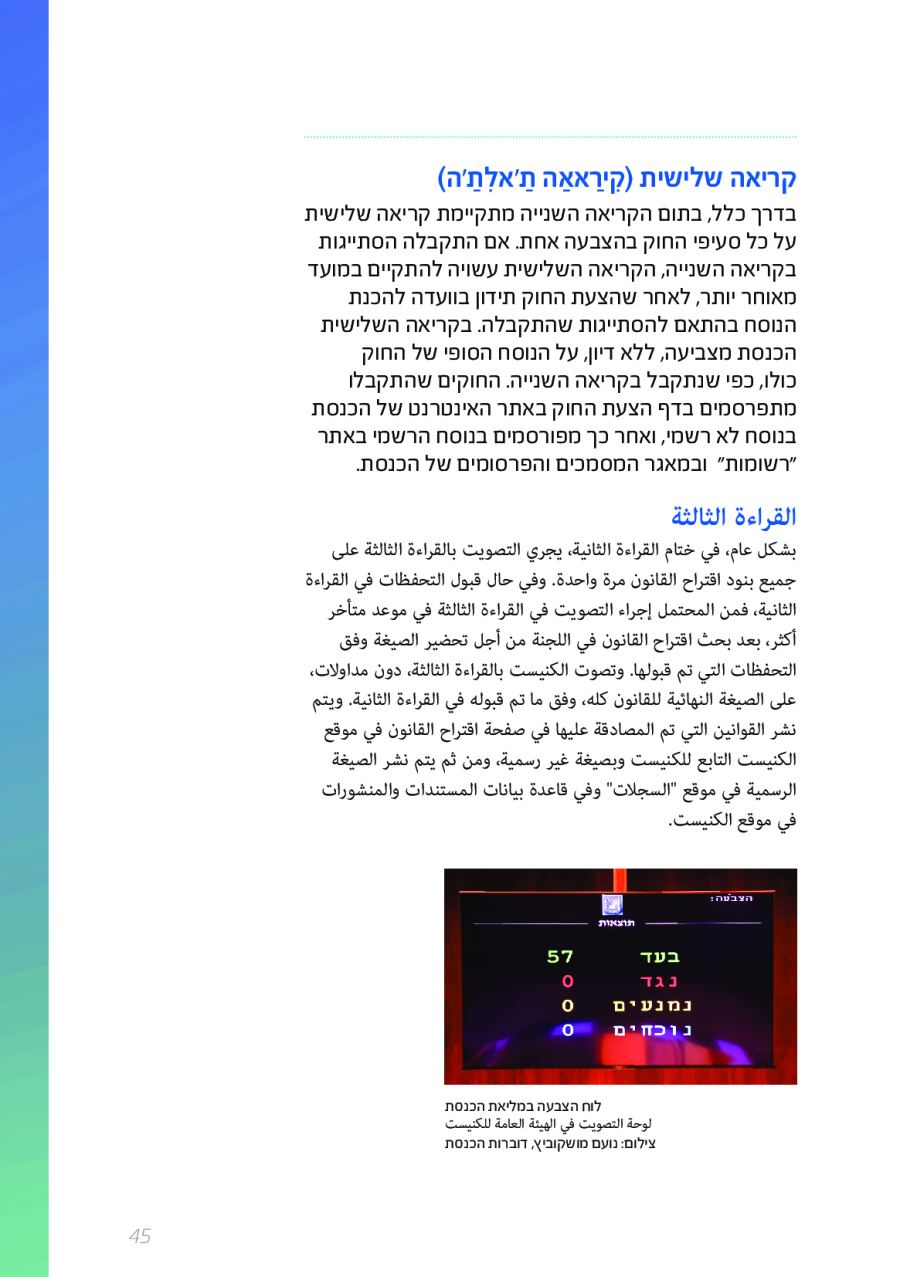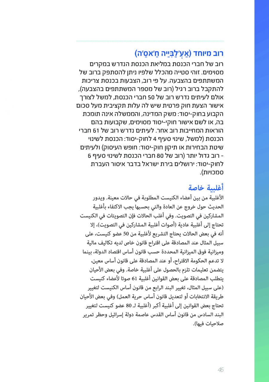 يحتوي الكتيب الجديد على عشرات الاصطلاحات البرلمانية الأساسية المستخدمة في الكنيست الإسرائيلية وهي مكتوبة باللغتين العبرية والعربية، مع إرفاق شرح مفصل حول كل اصطلاح بهاتين اللغتين.