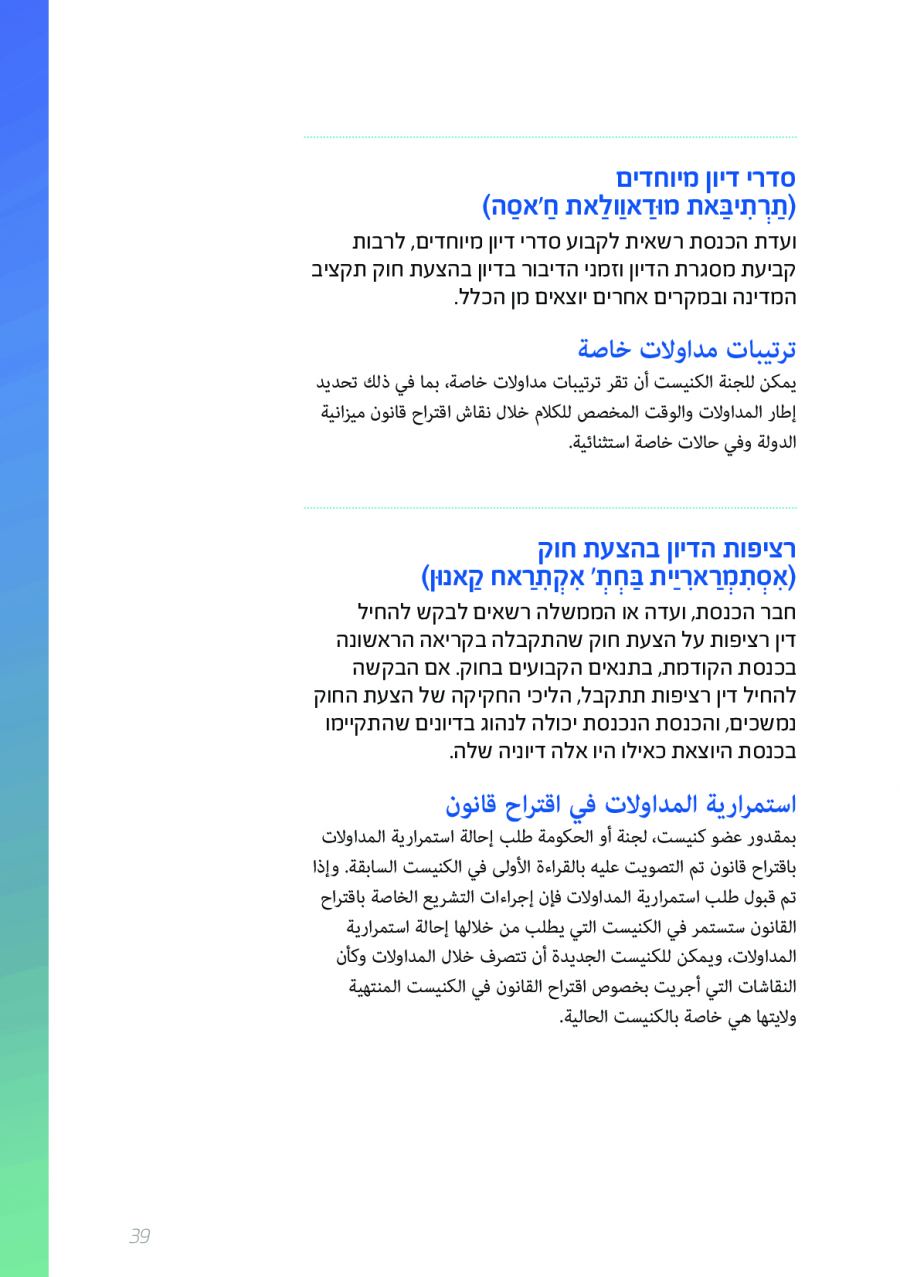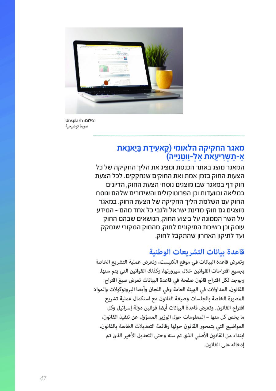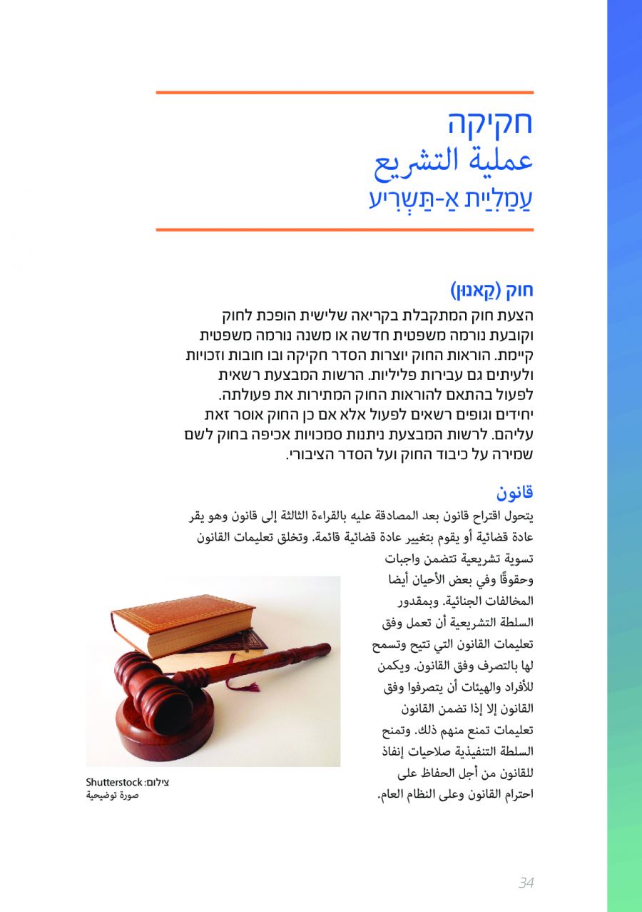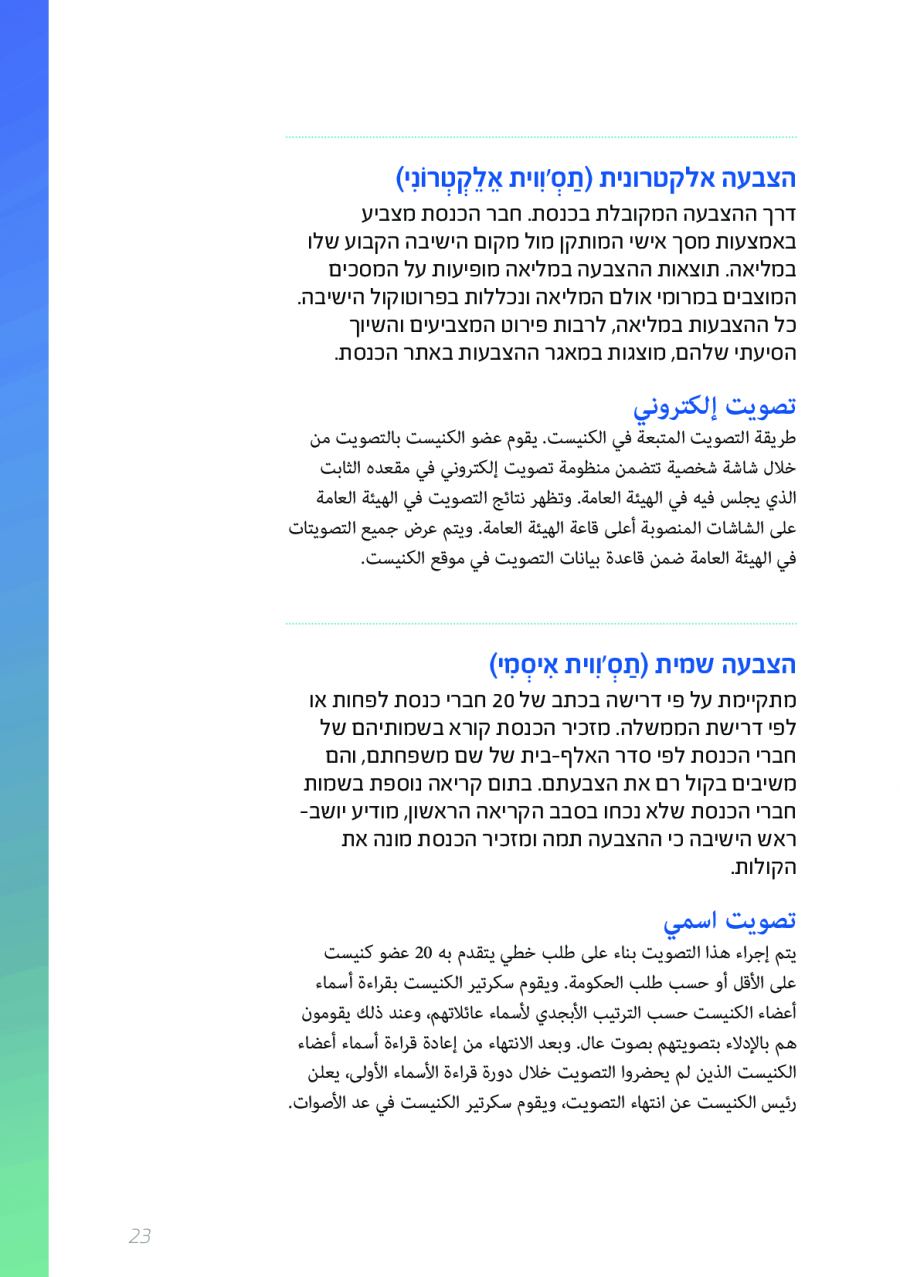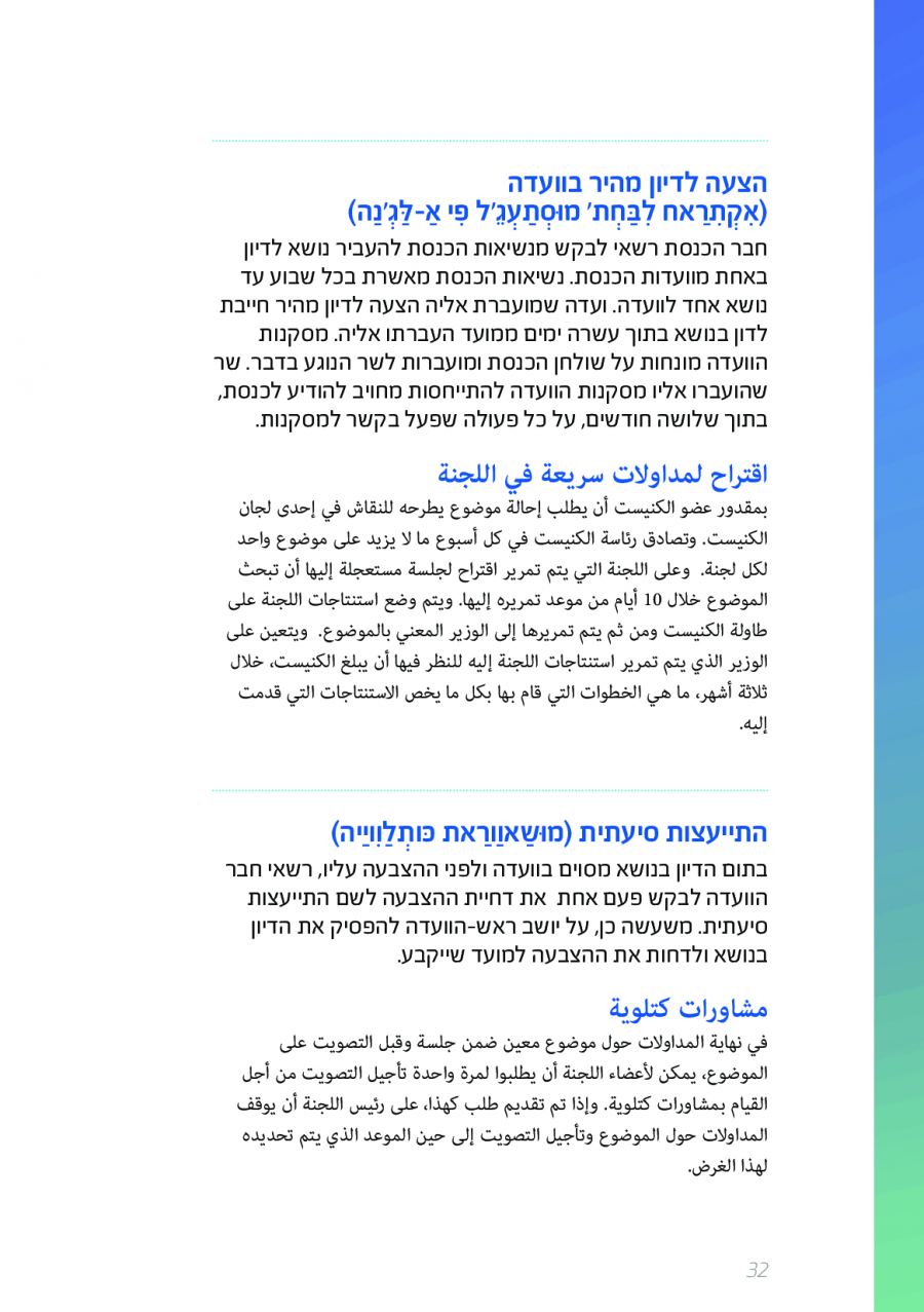 يحتوي الكتيب الجديد على عشرات الاصطلاحات البرلمانية الأساسية المستخدمة في الكنيست الإسرائيلية وهي مكتوبة باللغتين العبرية والعربية، مع إرفاق شرح مفصل حول كل اصطلاح بهاتين اللغتين.
