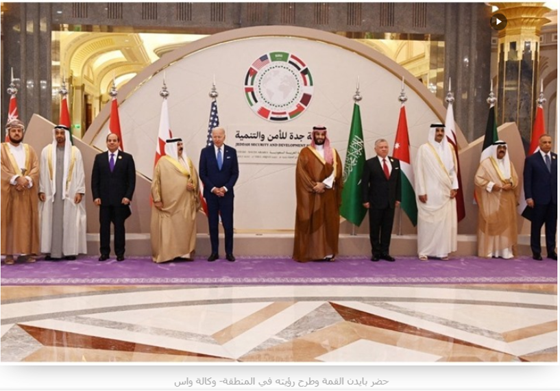 وشارك بايدن القادم الجمعة من زيارة للإسرائيليين، في القمة، بالإضافة إلى ولي العهد الكويتي مشعل الأحمد الجابر الصباح، ورئيس النظام في مصر عبد الفتاح السيسي، ورئيس الإمارات محمد بن زايد آل نهيان، وأسعد بن طارق آل سعيد، نائب رئيس الوزراء الممثل الخاص لسلطان عمان.