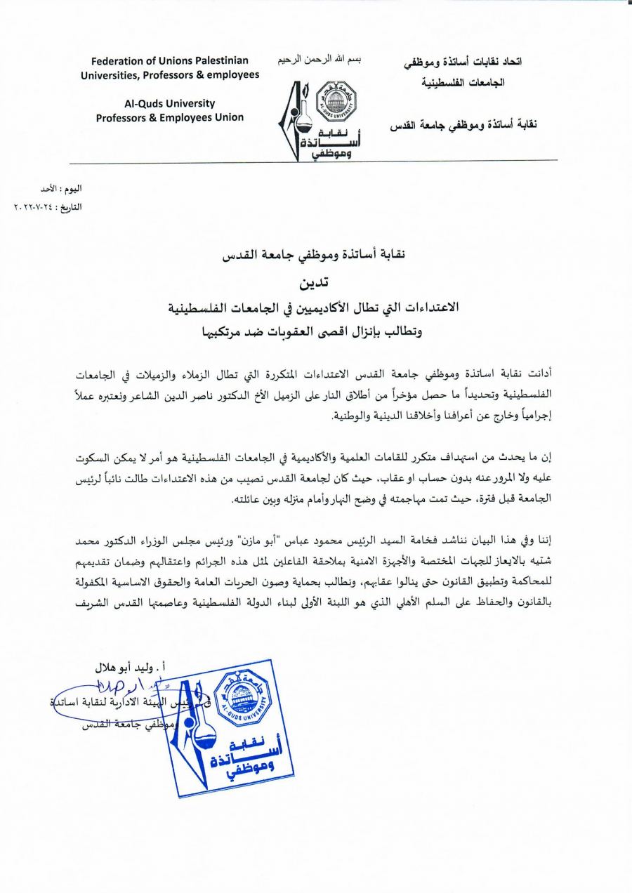 نقابة أساتذة وموظفي جامعة القدس تدين الاعتداءات التي تطال الأكاديميين في الجامعات الفلسطينية وتطالب بإنزال اقصى العقوبات ضد مرتكبيها