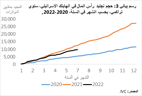 · في بداية عام 2022، تراجعت مؤشرات أسهم التكنولوجيا في إسرائيل وحول العالم وتراجعت تقديرات قيمة الشركات. وانخفض عدد عمليّات إطلاق شركات الهايتك (بالأساس الإصدارات الأولية) بشكل كبير. لا يزال تجنيد رأس المال في النصف الأول من العام مرتفعًا نسبيًا مقارنةً بمعظم السنوات السابقة، ولكنه أقل مما كان عليه في عام 2021، ومن المتوقع أن يستمر التباطؤ.