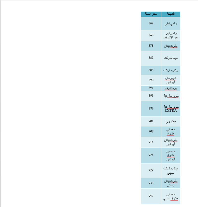 · ضمن قائمة الشبكات التي تم فحصها، الشبكة التي باعت سلة المنتجات الأساسية بالسعر الأرخص في شهر تمّوز هي "رامي ليفي"، حيث بلغت كلفة السلة في هذا الشهر 842 شيكل.