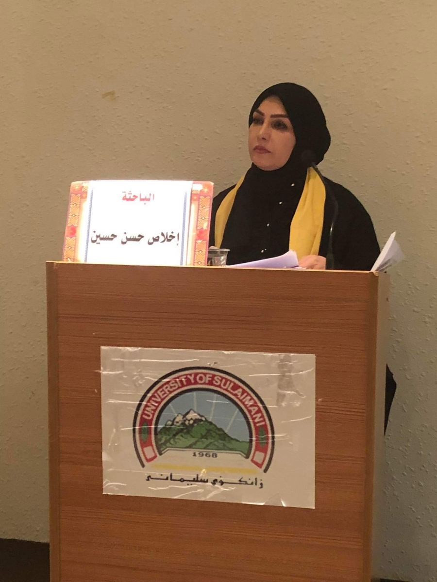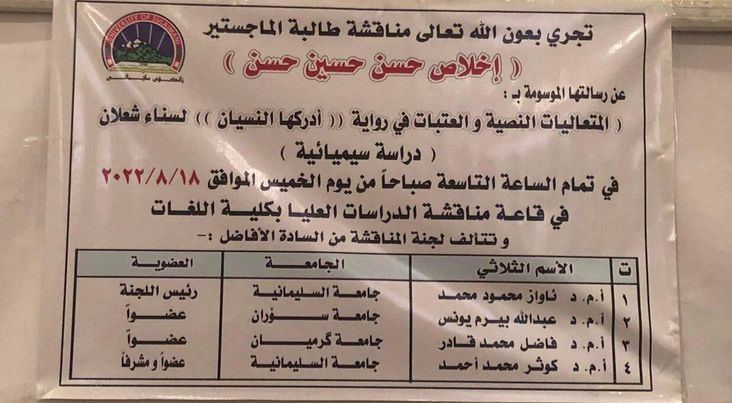 كنوز نت - السّليمانيّة/ إقليم كردستان العراق/ العراق: ناقشت الباحثة الكرديّة إخلاص حسن حسين حسن رسالتها الماجستير بعنوان "المتعاليات النّصيّة والعتبات في رواية أدركها النّسيان لسناء الشعلان: دراسة سيميائيّة" في قسم اللّغة العربيّة وآدابها في كليّة اللّغات في جامعة السّليمانيّة في إقليم كردستان العراق استكمالاً لمتطلبات الحصول على درجة الماجستير في فرع اللّغة العربيّة.