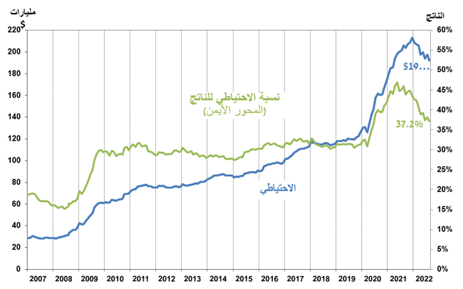 رسم بياني 1- مستوى احتياطي النقد الأجنبي ونسبة الاحتياطي إلى الناتج المحلي الإجمالي، 2007 إلى 2022