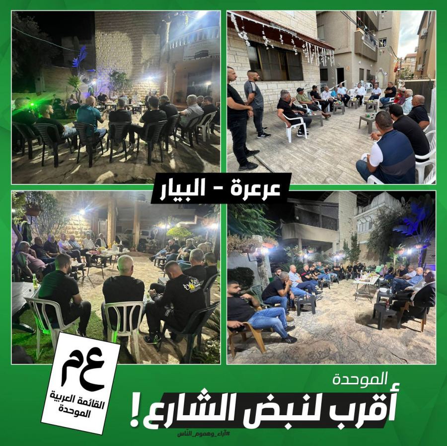 العديد من الحلقات البيتية الداعمة والمؤيدة للموحدة في منطقة وادي عارة: في البيار في بيت السيد عاهد صالح (أبو مقلد)، وفي عارة في بيت السيد عاطف أبو شحادة (أبو علي)، وفي عرعرة في بيت السيد إياد أحمد مسعود (أبو علي)، بمشاركة النائب وليد طه، ومرشح وادي عارة والمثلث الشمالي عبد الكريم مصري.