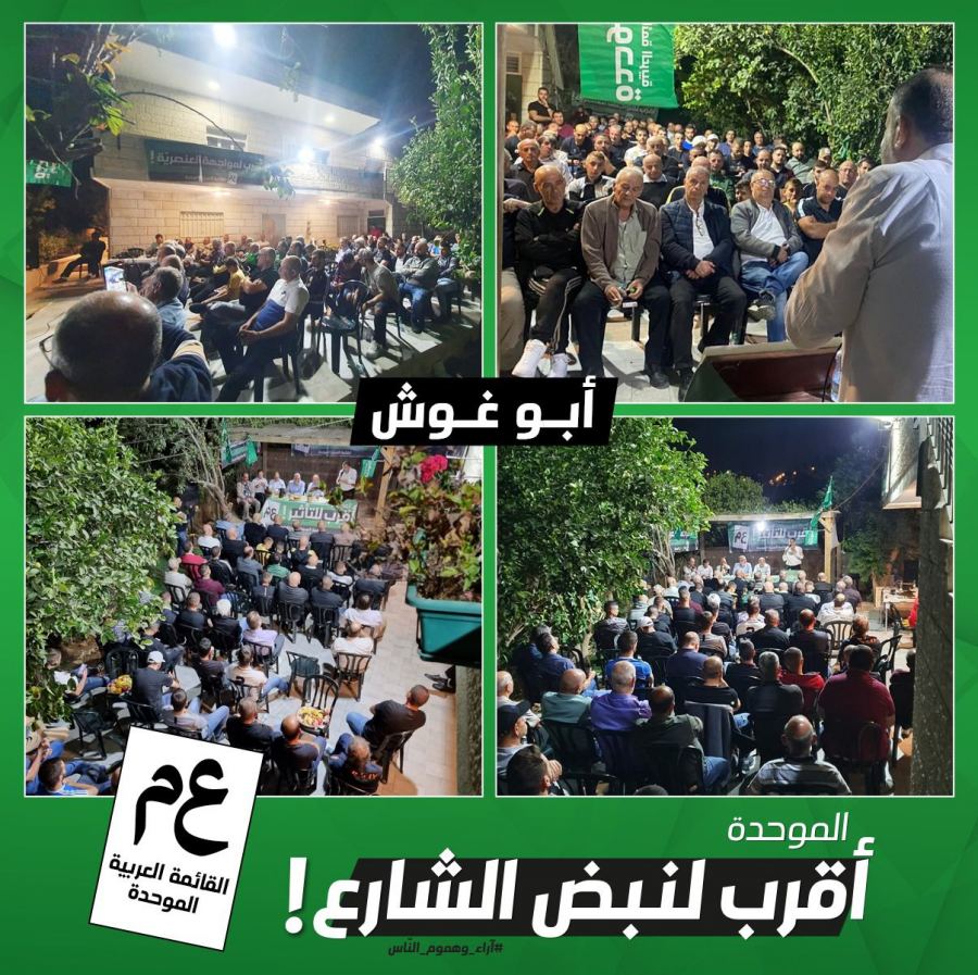 اجتماع انتخابي حاشد تأييدًا للموحدة ونهجها الأقرب لنبض الشارع، في قرية أبو غوش، في بيت السيد خميس إبراهيم (أبو زكي)، بمشاركة الشيخ صفوت فريج رئيس الحركة الإسلامية في البلاد، والنائب وليد طه، والمرشح إبراهيم أبو لبن.