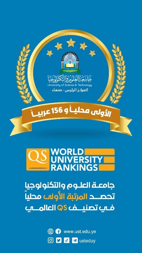 كنوز نت - اليمن / خاص - حققت جامعة العلوم والتكنولوجيا المرتبة الأولى محليا وعلى المرتبة ( 156 ) ضمن أفضل 200 جامعة عربية حسب نتائج تصنيف QS للجامعات حول العالم للعام 2022/ 2023م .