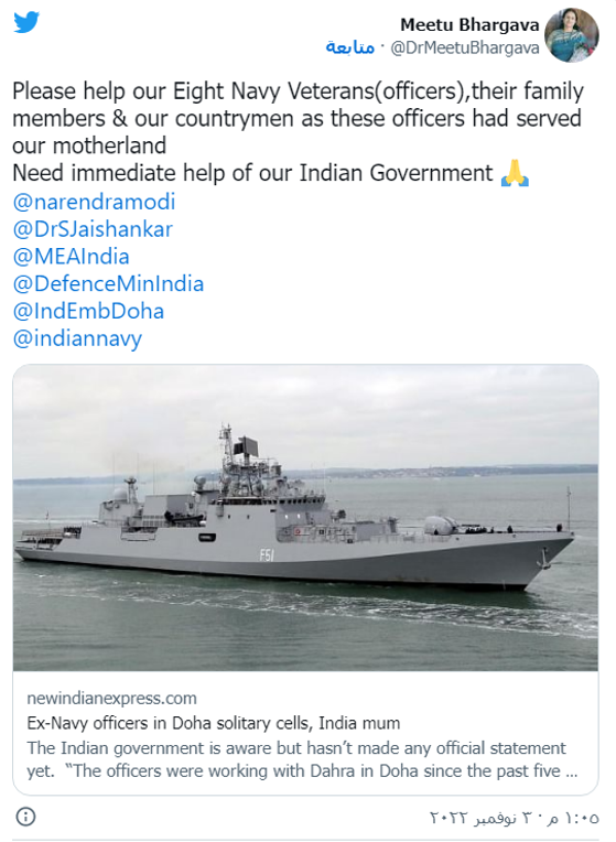 وفي 3 تشرين الثاني/نوفمبر، قالت وزارة الشؤون الخارجية إنّ "السفارة الهندية في الدوحة تبذل كلّ الجهود الممكنة للإفراج المبكر عن أفراد البحرية الثمانية السابقين المحتجزين وإعادتهم إلى الوطن".