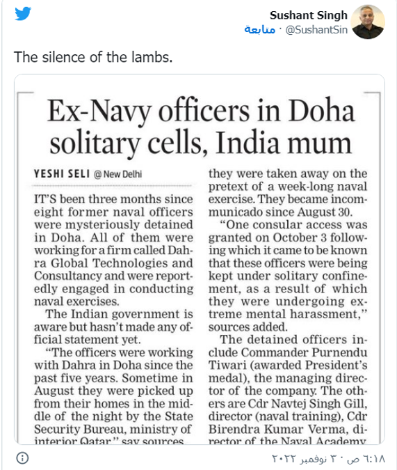 وكانت صحيفة "إنديان إكسبرس" أوضحت أنّ "المخابرات القطرية اعتقلت الأفراد الـ8 في البحرية الهندية في قطر قبل 72 يوماً"، وأشارت إلى أنّ المسؤول الهندي تمّ إرساله في نهاية تشرين أول/أكتوبر لمساعدة مسؤولي سفارتها في تأمين الإفراج عن الموظفين.