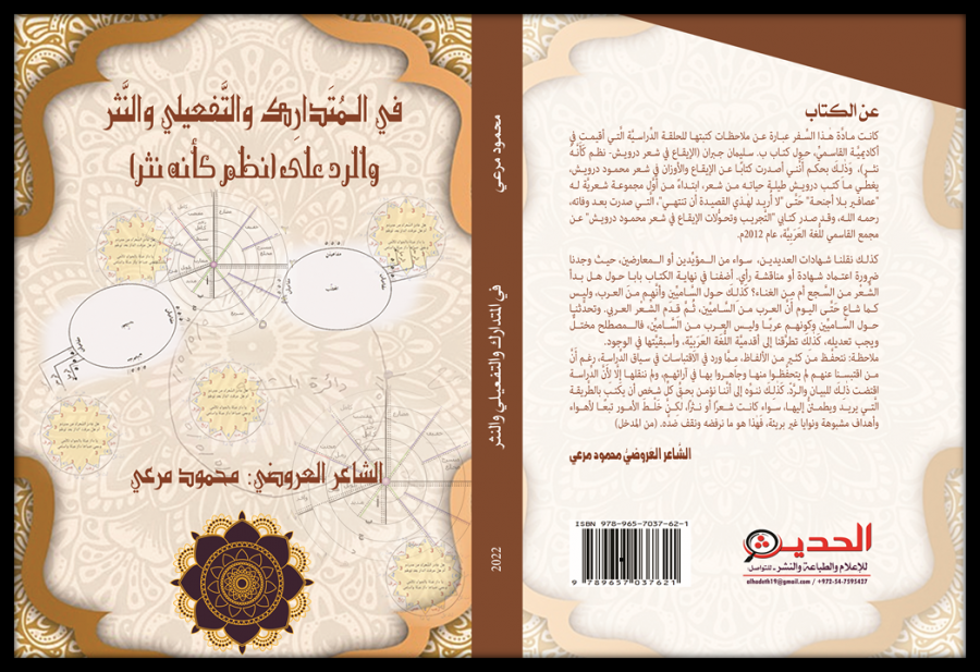 كنوز نت - صدر عن دار "الحديث للإعلام والطِّباعة والنَّشر"، بإدارة الأديب والإعلامي فهيم أبو ركن كتاب "في الـمُتَدارِك والتَّفعيلي والنَّثر والرَّدّ على (نظم كَأَنَّهُ نثر)" للشَّاعر العروضيِّ محمود مرعي، وهو كتاب في البحث الأدبي والنَّقد (611) صفحة من القطع الكبير.