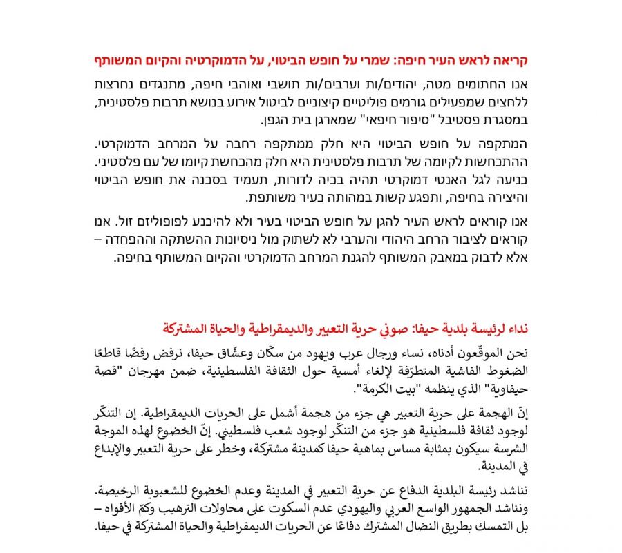 ولفتت الرسالة إلى توقيع أكثر من 700 إنسان عربي ويهودي على عريضة تحت عنوان "نداء لرئيسة بلدية حيفا: صوني حرية التعبير والديمقراطية والحياة المشتركة". وقد جاء فيها: "نحن الموقّعون أدناه، نساء ورجال عرب ويهود من سكّان وعشّاق حيفا، نرفض رفضًا قاطعًا الضغوط الفاشية المتطرّفة لإلغاء أمسية حول الثقافة الفلسطينية، ضمن مهرجان "قصة حيفاوية" الذي ينظمه "بيت الكرمة"؛ إنّ الهجمة على حرية التعبير هي جزء من هجمة أشمل على الحريات الديمقراطية. إن التنكّر لوجود ثقافة فلسطينية هو جزء من التنكّر لوجود شعب فلسطيني. إنّ الخضوع لهذه الموجة الشرسة سيكون بمثابة مساس بماهية حيفا كمدينة مشتركة، وخطر على حرية التعبير والإبداع في المدينة؛ نناشد رئيسة البلدية الدفاع عن حرية التعبير في المدينة وعدم الخضوع للشعبوية الرخيصة. ونناشد الجمهور الواسع العربي واليهودي عدم السكوت على محاولات الترهيب وكمّ الأفواه – بل التمسك بطريق النضال المشترك دفاعًا عن الحريات الديمقراطية والحياة المشتركة في حيفا". وأكد زعاترة وشلبي وجود جمهور عربي ويهودي كبير في حيفا يدعم هذه القيم ويرى فيها مدماكًا أساسيًا في حيفا، لكي تكون فعلاً نموذجًا مغايرًا للحياة المشتركة بين أبناء الشعبين في المدينة.