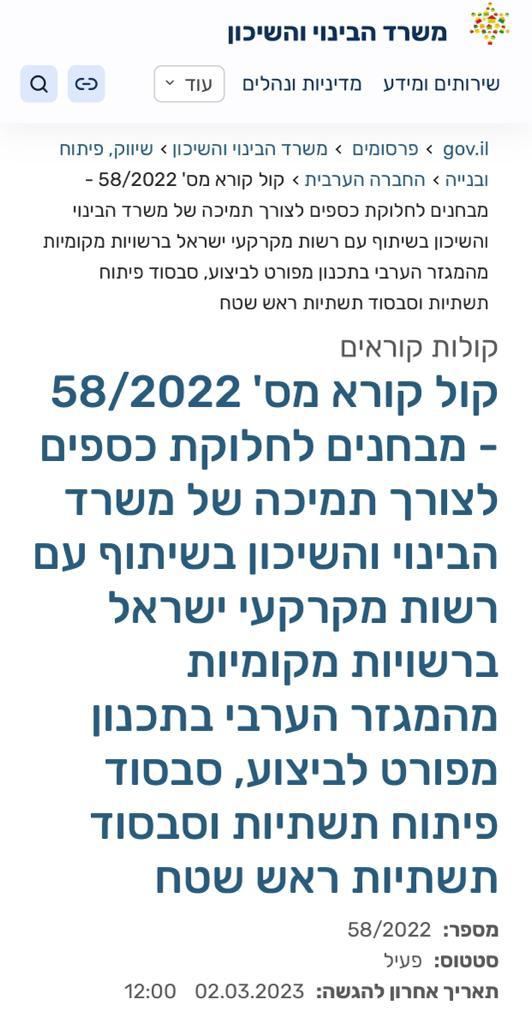 ويهدف هذا النداء -كما ورد في نصّه في موقع وزارة الإسكان- إلى دعم البلديّات والمجالس المحلية العربية في عملية التخطيط وتطوير البنى التحتية في الأراضي بملكية خاصة، وكذلك تطوير البنى التحتية الموصلة للقسائم ضمن هذه الأراضي.