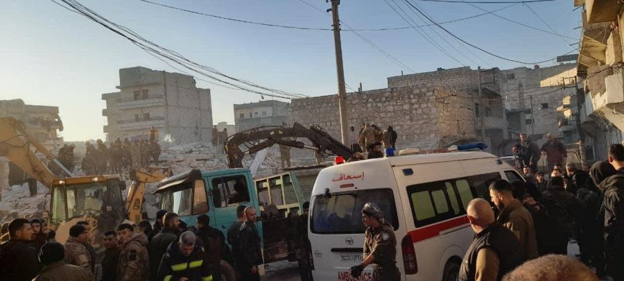 وأفاد نشطاء المرصد السوري لحقوق الإنسان، بأن المبنى يضم 7 عائلات يبلغ عدد أفرادها 30 شخصا ولا زال الغالبية منهم عالقون تحت الأنقاض.