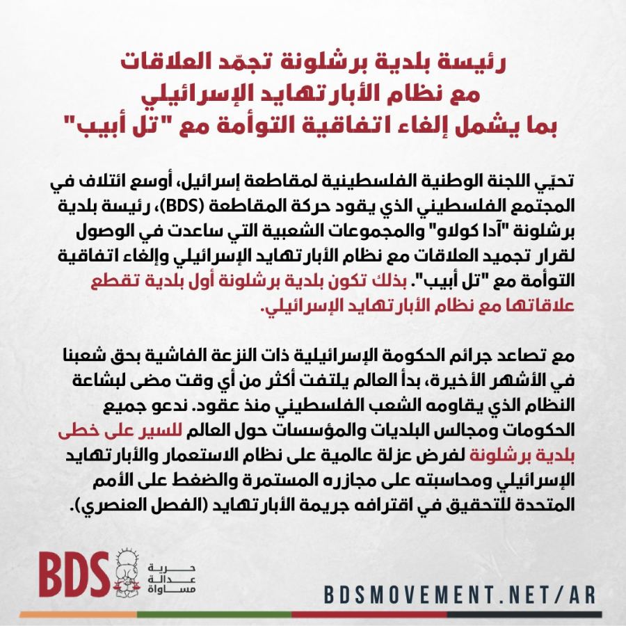 وأضاف أن كولاو "أشارت على وجه التحديد إلى الكيانات الاجتماعية التي تقود مبادرة المواطنين لدعم الشعب الفلسطيني التي استضافتها في قاعة المدينة تحت عنوان (برشلونة مع الفصل العنصري لا، برشلونة مع حقوق الإنسان نعم)".
