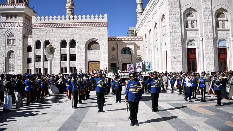 صلاة الجنازة على جثامين اللواء الركن علي الطمبالة العولقي والمستفة والسلمي بجامع الشعب بأمانة العاصمة، حيث جرت لجثامينهم الطاهرة مراسم تشييع رسمية شارك فيها عدد القيادات العسكرية والسياسية