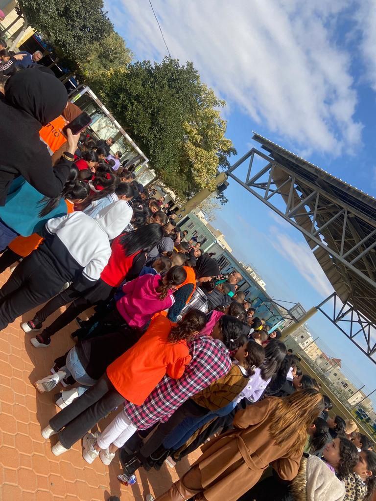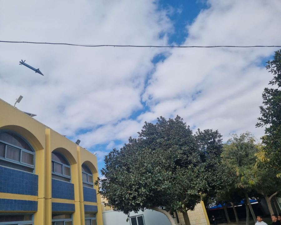 حيث دخل الطلاب الى الملاجئ والغرف الامنة عند سماع صافرات الانذار خلال تواجد الطلاب في ساحة المدرسة.