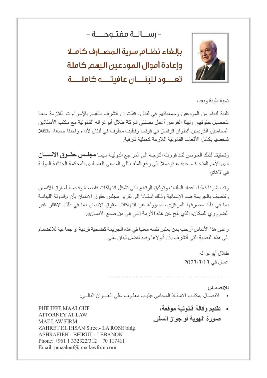 تلبية لنداء من المودعين وجمعياتهم في لبنان، قبلت أن أتشرف بالقيام بالإجراءات اللازمة سعيا لتحصيل حقوقهم. ولهذا الغرض أعمل بصفتي شركة طلال أبوغزاله القانونية مع مكتب الأستاذين المحاميين الكريمين أنطوان قرقماز في فرنسا وفيليب معلوف في لبنان لأداء واجبنا جميعا، متكفلا شخصيا بكامل الأتعاب القانونية اللازمة كعملية شرفية.