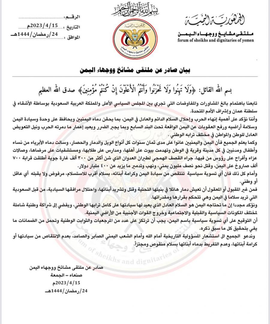 ملتقى مشائخ ووجهاء اليمن يدعو لسلام عادل ودائم وشراكة وطنية