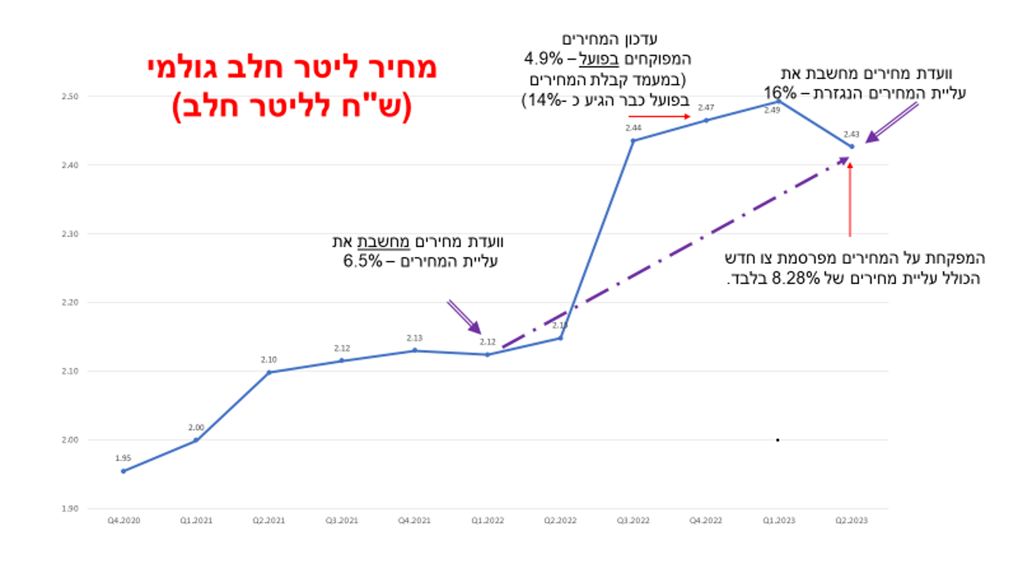الحليب الخام، يشكل مكون مركزي بتكاليف انتاج منتجات الحليب ( فوق 50% من تكاليف الإنتاج) ويقف على ربع سنوي للسنة حول 2.43 شيكل لليتر.