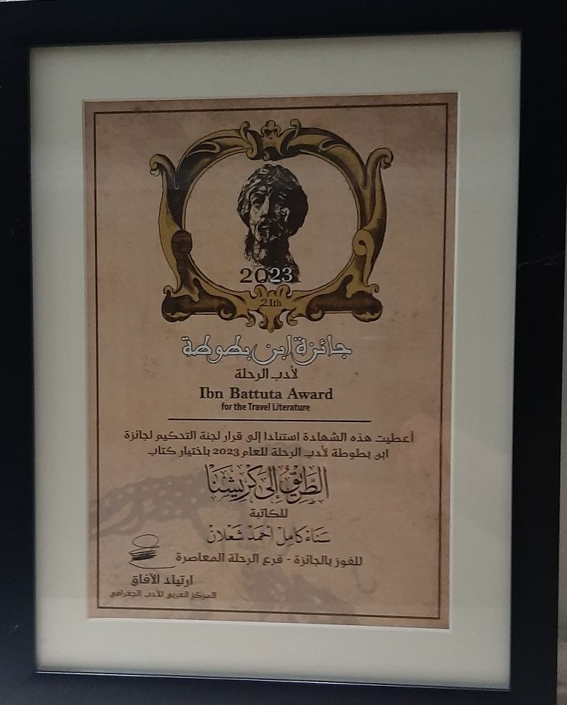 كنوز نت - أبو ظبي/ الإمارات العربيّة المتّحدة: في حفل رسميّ في العاصمة الإماراتيّة أستلمت الأديبة د. سناء الشّعلان (بنت نعيمة) جائزة ابن بطّوطة لأدب الرّحلة في الدّورة الحادية والعشرين الموافقة للعام 2023 في فئة (الرّحلة المعاصرة: سندباد الجديد) عن كتاب رحلاتها في الهند وكشمير بعنوان "الطّريق إلى كريشنا: رحلات في كشمير والهند".
