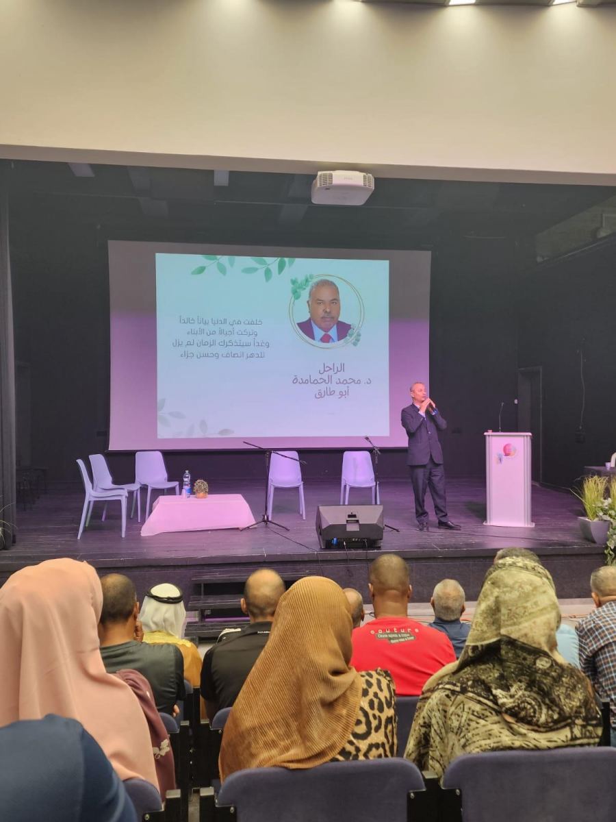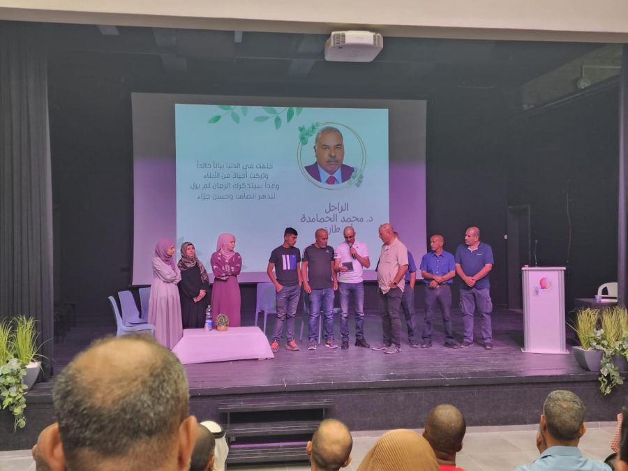 كنوز نت - عممت الناطقة الإعلامية للمجتمع العربي بشركة المراكز الجماهيرية رانية مرجية البيان التالي : نظم المركز الجماهيري شقيب السلام حفل تكريم لمسيرة الراحل الدكتور محمد الحمامدة (أبو طارق )مدير ومؤسس المدرسة الثانوية الشاملة في شقيب السلام