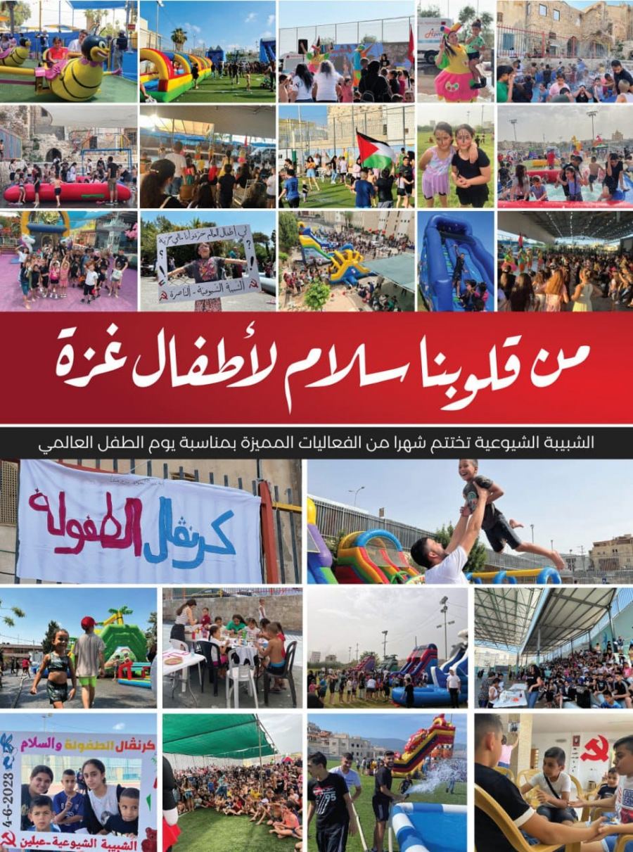 كنوز نت - شادي ناصر : اختتمت الشبيبة الشيوعية، في حزيران، سلسلة ضخمة من كرنفالات الطفولة والسلام في عدة بلدان وقرى بدعوة من فروعها ومناطقها ولجنتها المركزية، وانطلقت سلسلة الكرنفالات منذ مطلع الشهر تحت عنوان "من قلوبنا سلام لأطفال غزة" بمناسبة يوم الطفولة العالمي.