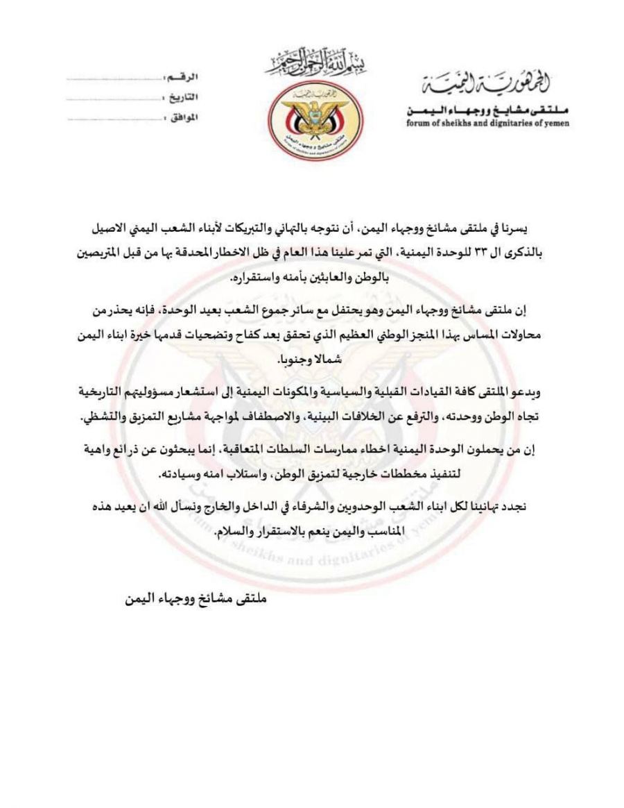 كما دعا البيان ابناء اليمن الى الالتفاف حول وطنهم ، والتمسك بوحدتهم و هويتهم الجامعة، ومصدر انتمائهم ، فاي مساس بها هو استلاب للسيادة وعبث بالحاضر والمستقبل.