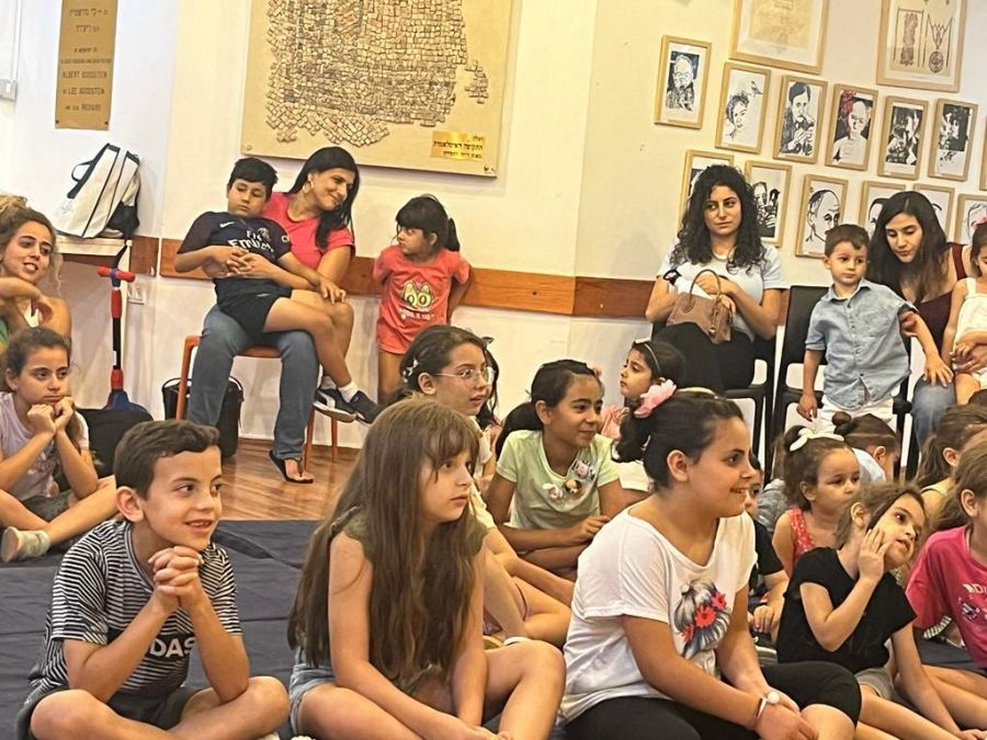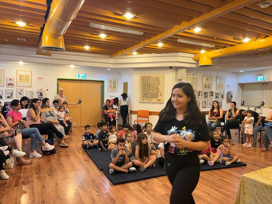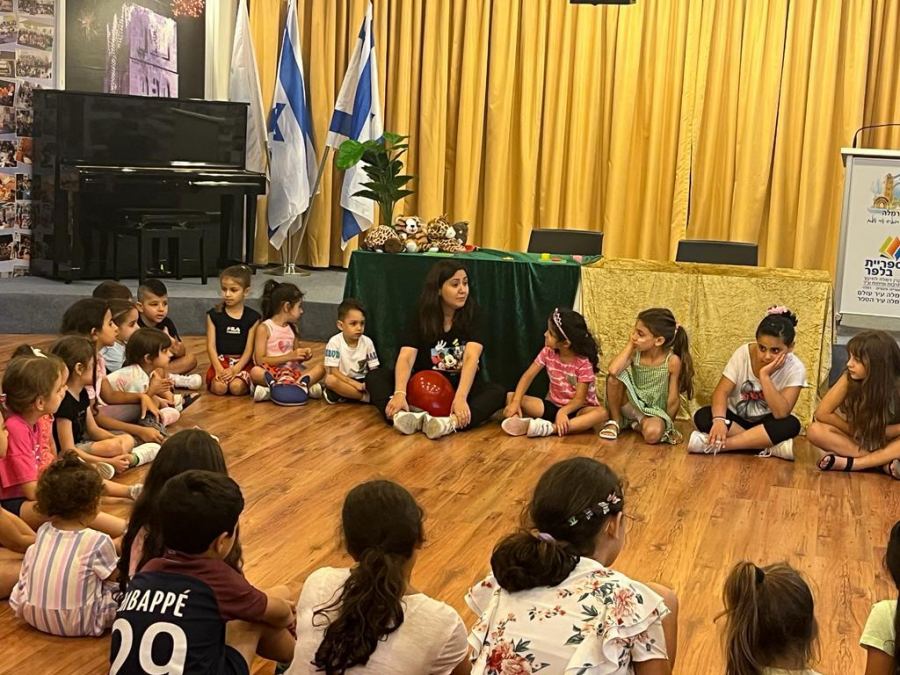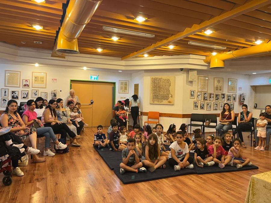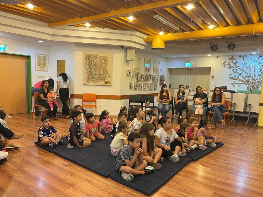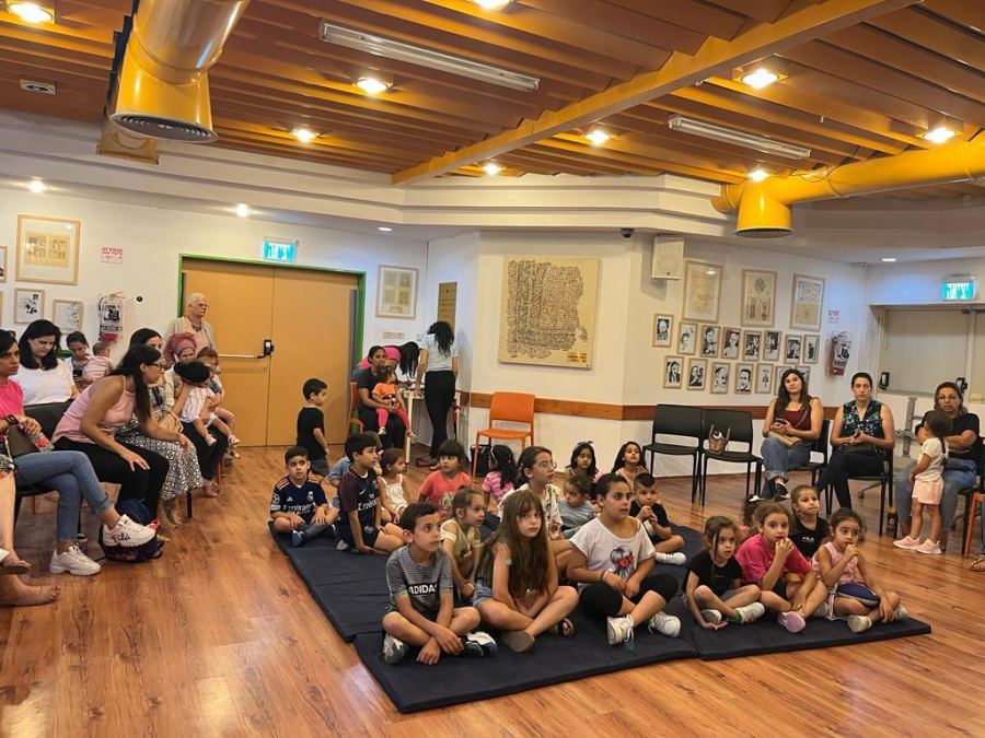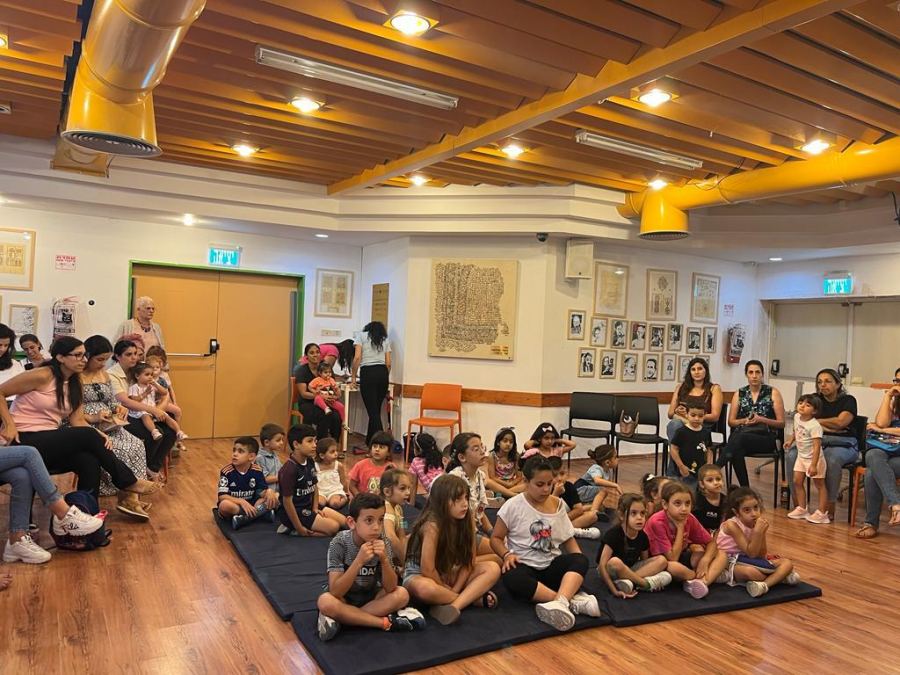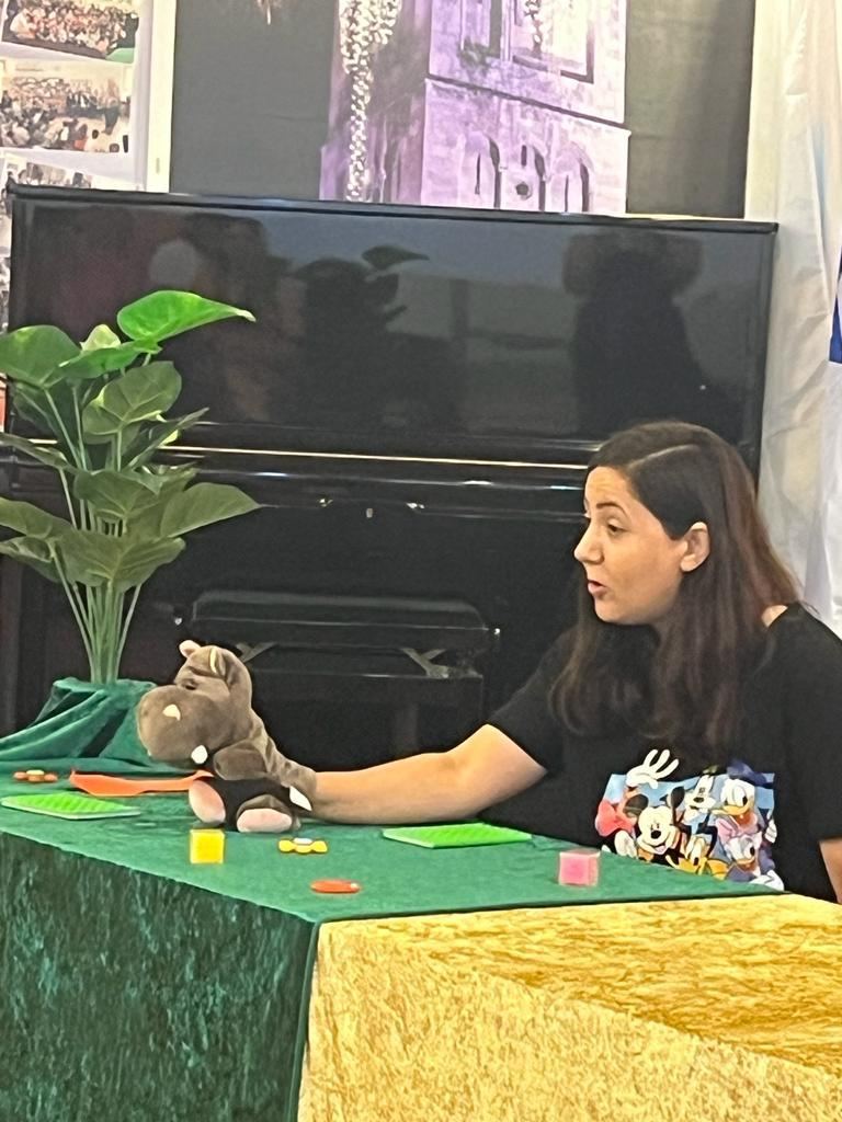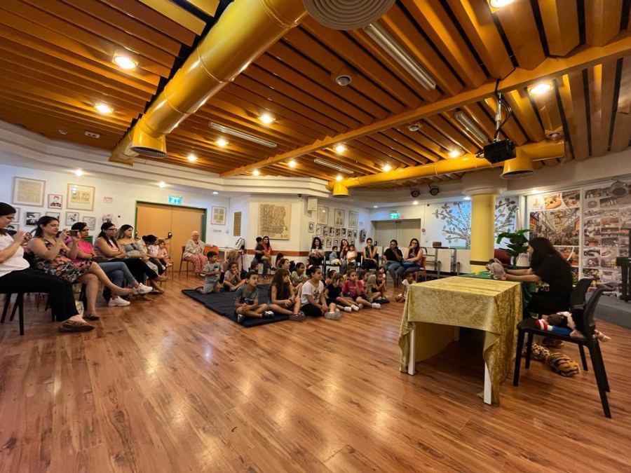 عشرات الأطفال في مسرح للدمى مع الحكواتية ماريا زعرور مرجية في مكتبة بلفر الرملة