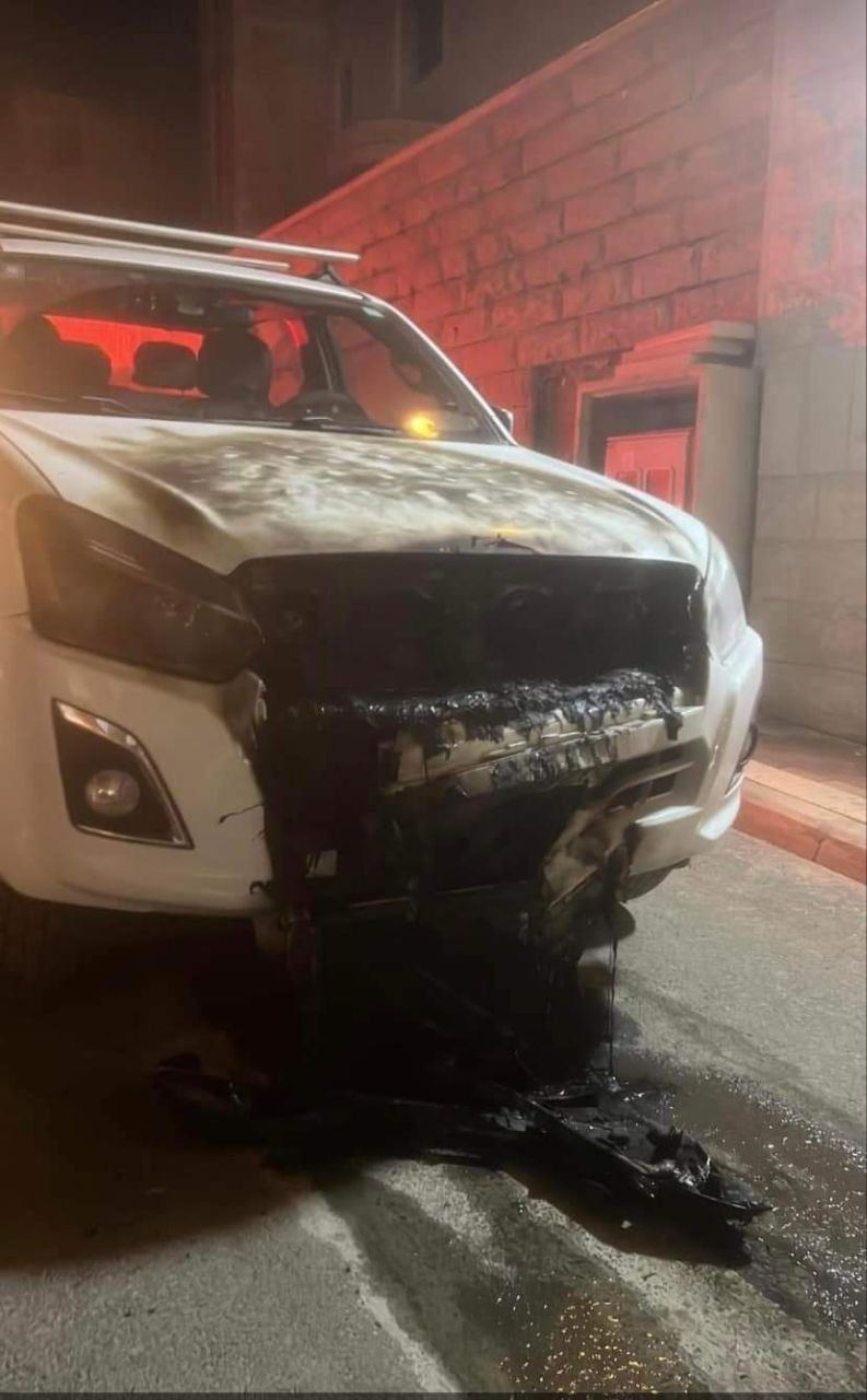 كنوز نت - إرهابيون مستوطنون،يقومون بإحراق سيارات في قرية أبو غوش، قرب القدس، وخطوا على جدران في القرية