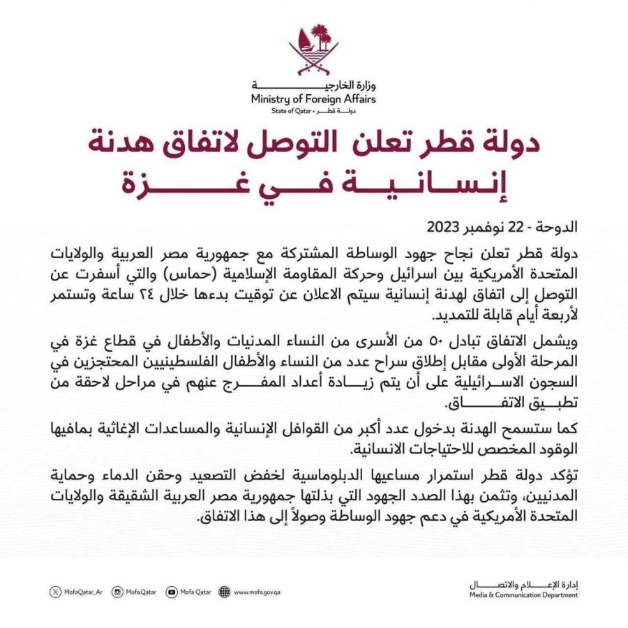 كنوز نت - أعلنت دولة قطر نجاح جهود الوساطة المشتركة مع مصر والولايات المتحدة بين إسرائيل وحركة المقاومة الإسلامية (حماس)، إذ أسفرت عن التوصل إلى اتفاق على هدنة إنسانية في قطاع غزة تستمر لمدة 4 أيام قابلة للتمديد، وسيتم الإعلان عن توقيت بدئها خلال الـ24 ساعة المقبلة.