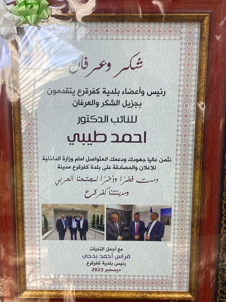 رئيس بلدية كفرقرع يقدم شهادة تقدير للنائب احمد الطيبي لدوره بالإعلان عن كفرقرع مدينة