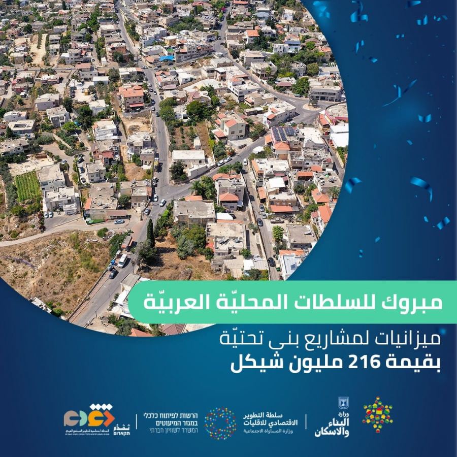 الإعلان عن نتائج إستحقاق البلدات العربية لتطوير البنية التحتية العامة بالأراضي الخاصة بميزانية 216 مليون شيكل ضمن خطة "تقدّم"