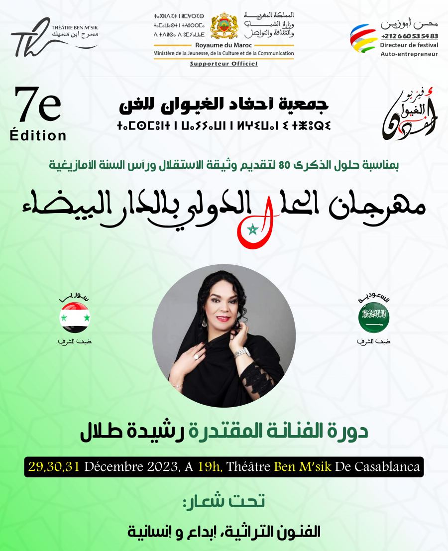 المهرجان، الذي ينظم بدعم من وزارة الشباب والثقافة والتواصل، اختار منظموه شعار "الفنون التراثية.. إبداع وإنسانية"، كما اختاروا تكريم الفنانة والمطربة رشيدة طلال، التي تحمل الدورة اسمها.