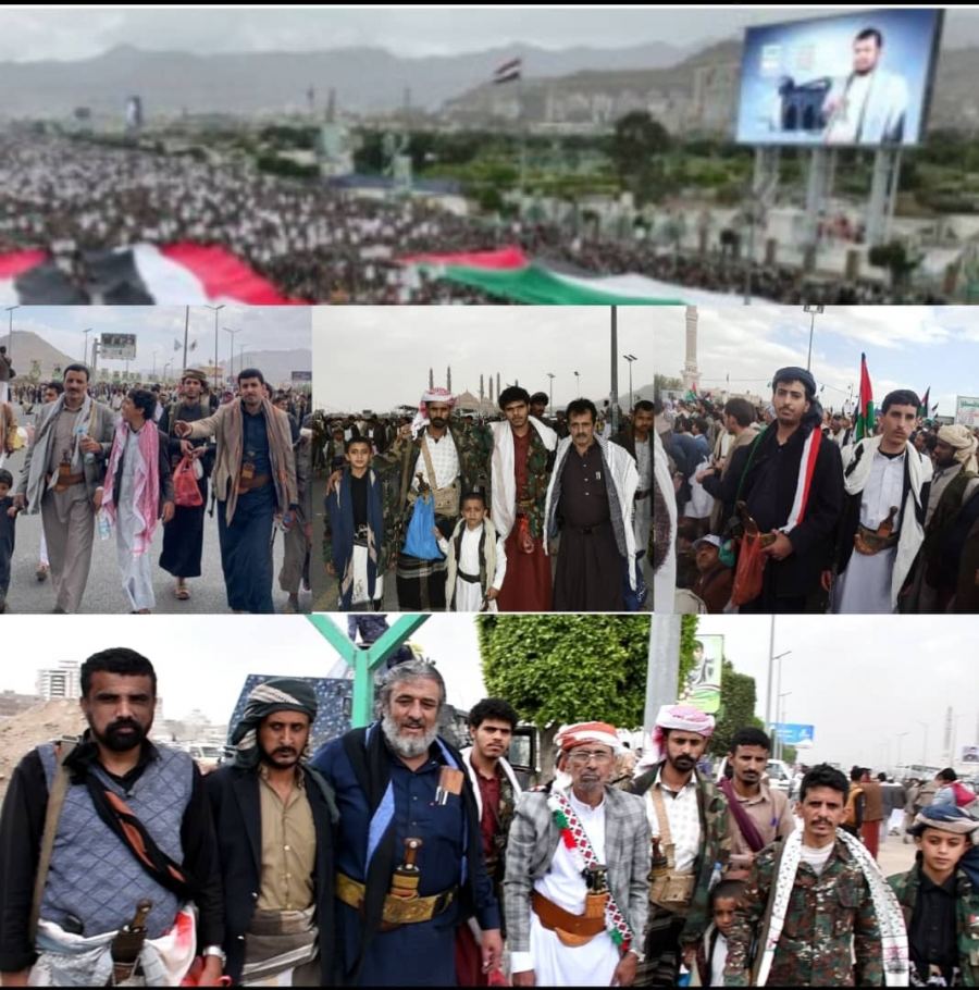 ورفع المشاركون الذين تقاطروا من كل حدب وصوب واكتظت بهم مداخل وشوارع العاصمة وصولا إلى ميدان السبعين العلمين اليمني والفلسطيني، حاملين بنادقهم.