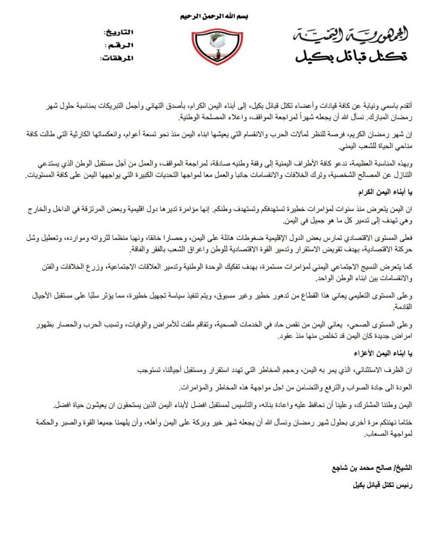 تكتل قبائل بكيل يهنئ أبناء اليمن بحلول شهر رمضان ويدعو الجميع الاصطفاف لمواجهة التحديات