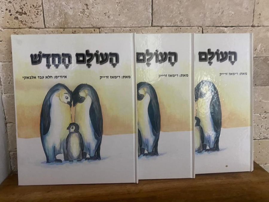 القصة الأولى بعنوان العالم الجديد ، تقع القصة في 32 صفحة من الحجم الكبير غلاف مقوى ، رسومات حلا عبد الباقي ، تتحدث القصة عن الفراق ، وفقدان الأم ، والحاجة إلى حياة جديدة للابن البطريق ، بدعم المجتمع، يشار أن الطبعة العربية للقصة صدرت عن حكايا ، رسومات الفنانة مها أبو حسين.