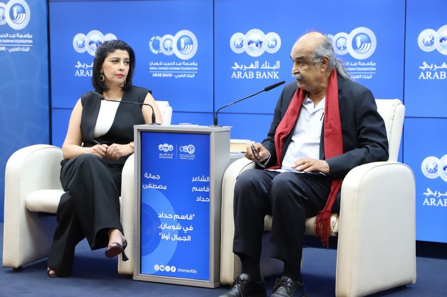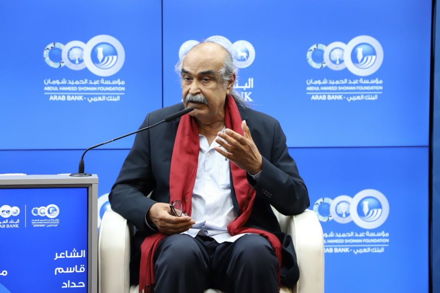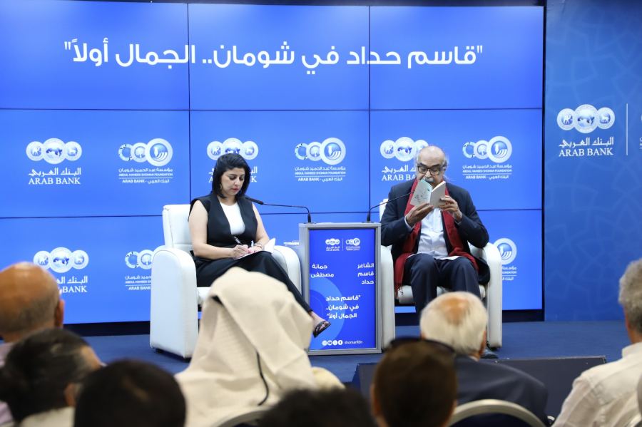 كنوز نت - عمان 4 حزيران - استضاف منتدى عبد الحميد شومان الثقافي، مساء أمس الاثنين، الشاعر البحريني قاسم حداد في أمسية شعرية بعنوان "قاسم حداد في شومان.. الجمال أولا"، ألقى فيها حداد مجموعة من قصائده بحضور حشد من المثقفين ومتذوقي الشعر والأدب.