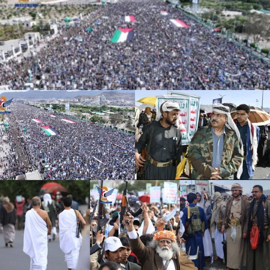 وتدفقت الحشود من كل حدب وصوب إلى ميدان السبعين، مرددة عبارات التهليل والتكبير ، والبراءة من أعداء الله، والتضامن والنصرة والوفاء للشعب الفلسطيني المظلوم، والجهوزية التامة لمواجهة العدوان الأمريكي البريطاني والتصدي لكل مؤامرتهم ومخططاتهم.