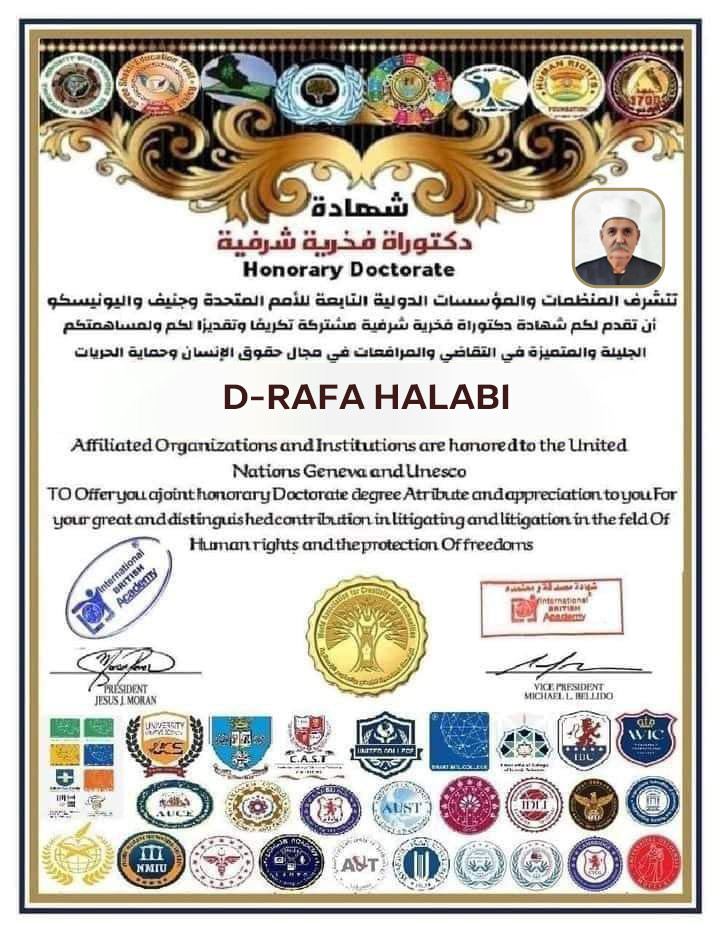 كنوز نت : يفاجئنا الدكتور الشيخ رافع حلبي من دالية الكرمل كعادته، بقرار المنظمات والمؤسسات الدولية التابعة للأمم المتحدة وجنيف واليونيسكو، أن تقدم له شهادة دكتوراة فخرية شرفية مشتركة، تكريمًا وتقديرًا لمساهماته الجليلة والمتميزة في التقاضي والمرافعات في مجال حقوق الإنسان وحماية الحريات.