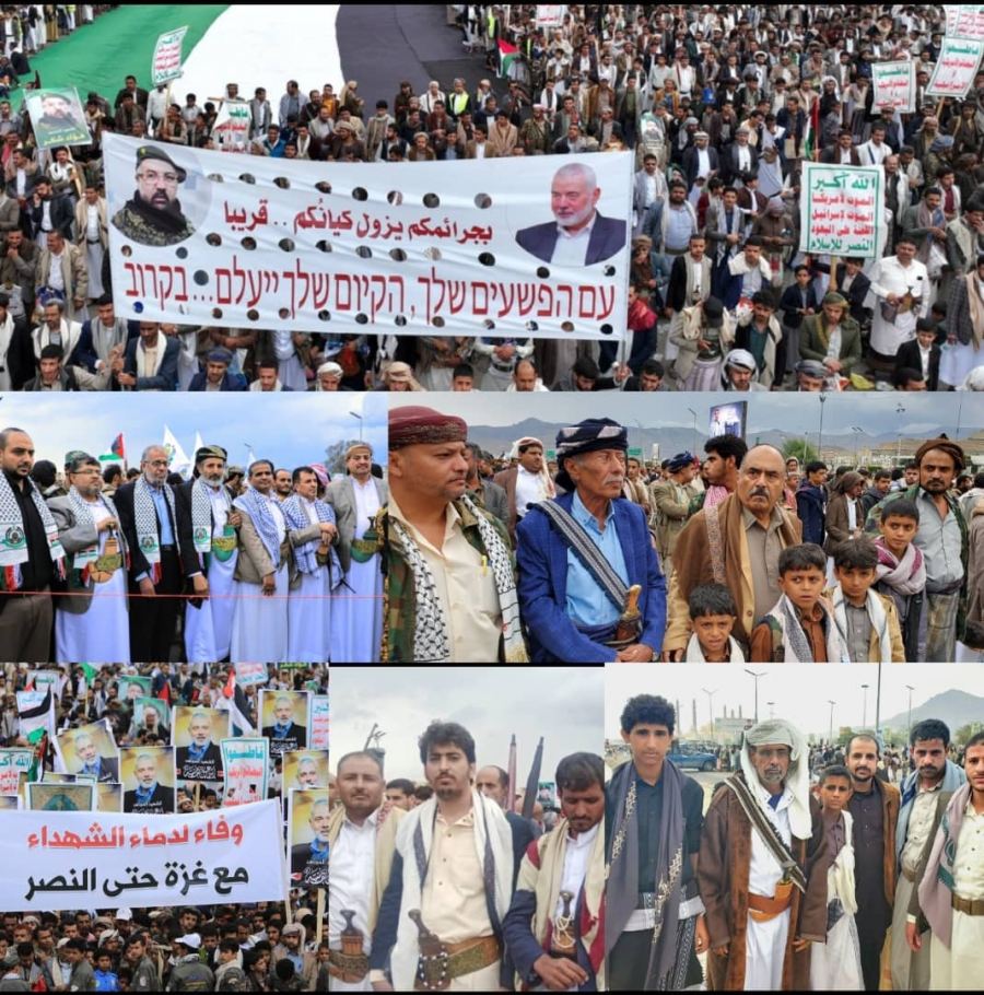 شهدت العاصمة صنعاء اليوم، طوفاناً بشرياً غير مسبوق في مسيرة "وفاءً لدماء الشهداء.. مع غزة حتى النصر" تأييداً لخيارات الرد المزلزل على العدو الصهيوني من قبل محور المقاومة.