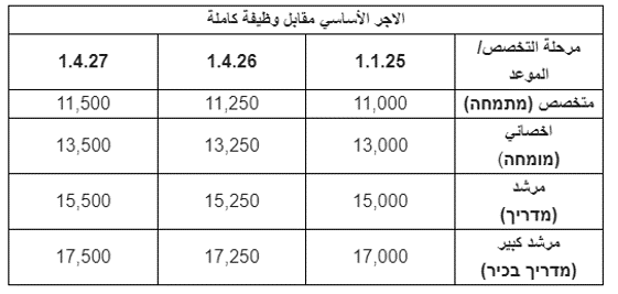• عن كل سنة عمل كأخصائي نفسي، ابتداء من عام 2026 فصاعدا، يحق للأخصائي الحصول على زيادة مقابل الأقدمية في العمل بنسبة 1.5% كل عام، حتى حد 25 سنة من الأقدمية.