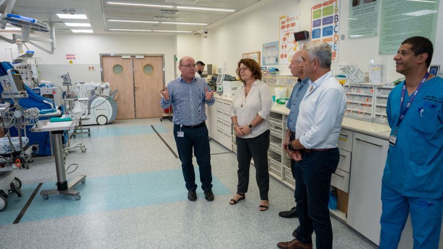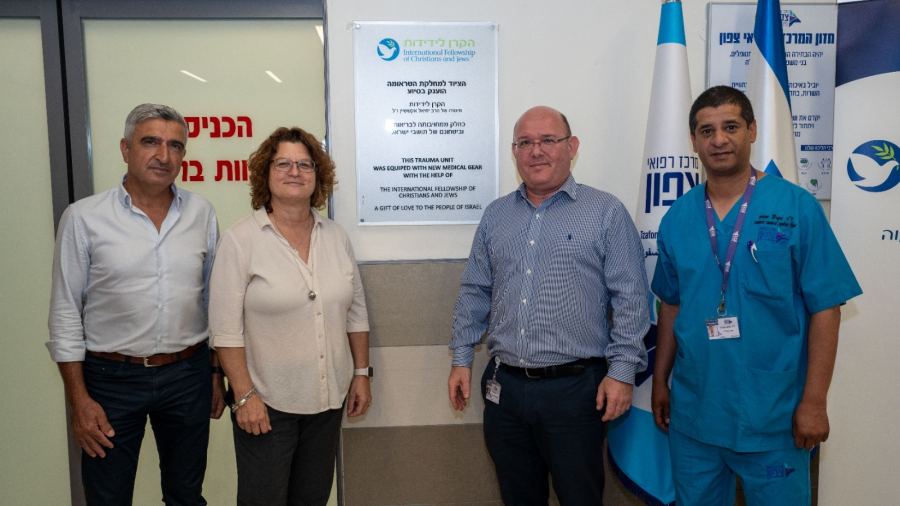 في الصورة مع اللافتة من اليمين: الدكتور معروف موسى مدير قسم الطوارئ، الدكتور نوعام يهوداي، مدير المركز الطبي تسافون، اييلت شيلا تمير المديرة العامة لصندوق الصداقة، مدير الطوارئ والأمن في صندوق الصداقة صفوان مريح.